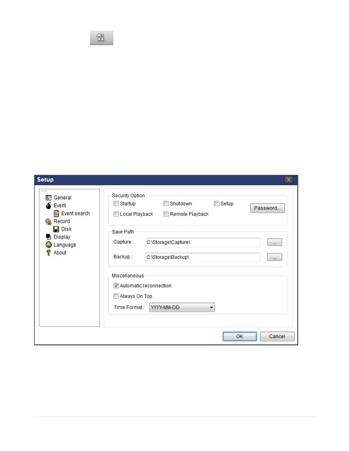Click the setup icon to setup the configuration of SpecoTech Multi Client software. The SETUP