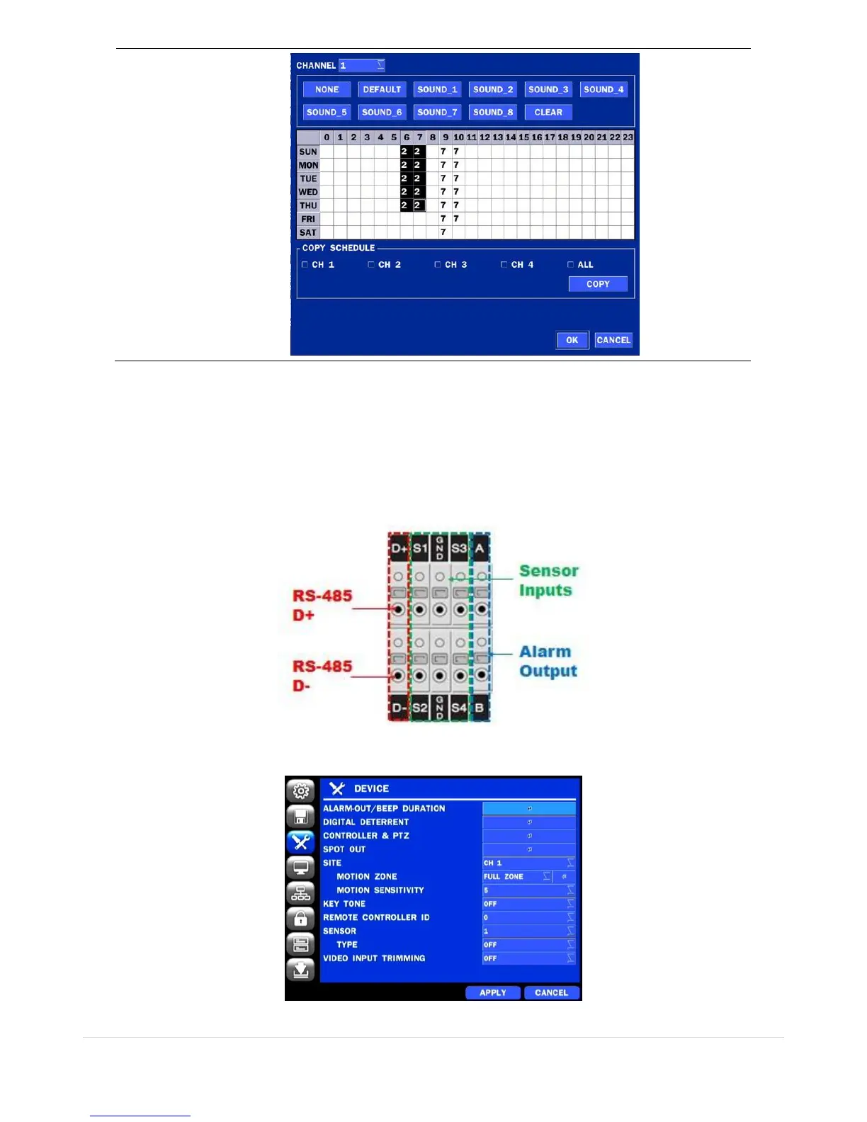 ① Connect the RS-485 cables of PTZ camera to the RS-485 port on the rear panel.