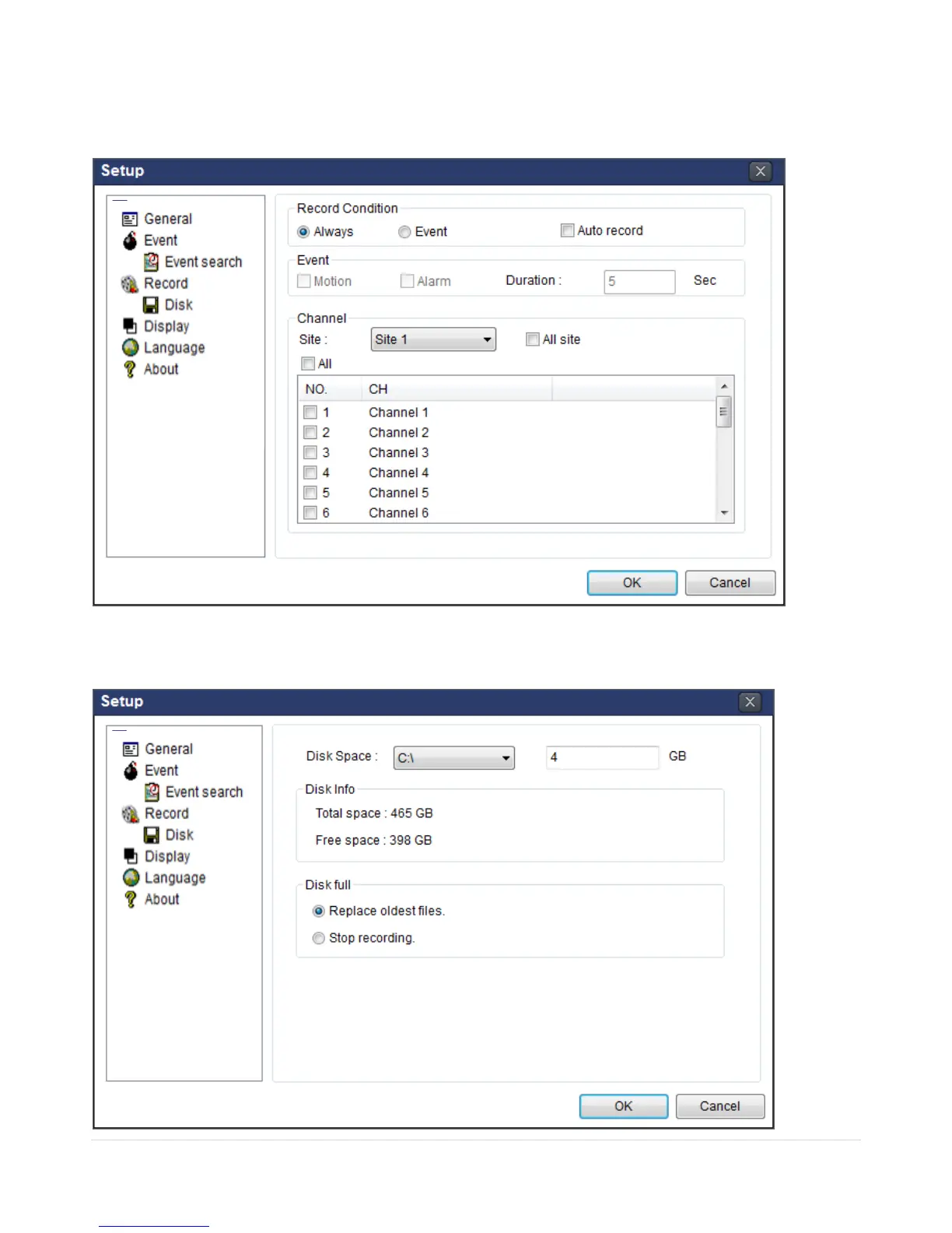 Record Setup: You can set the recording conditions as the following; Always, Event, or Auto record. And