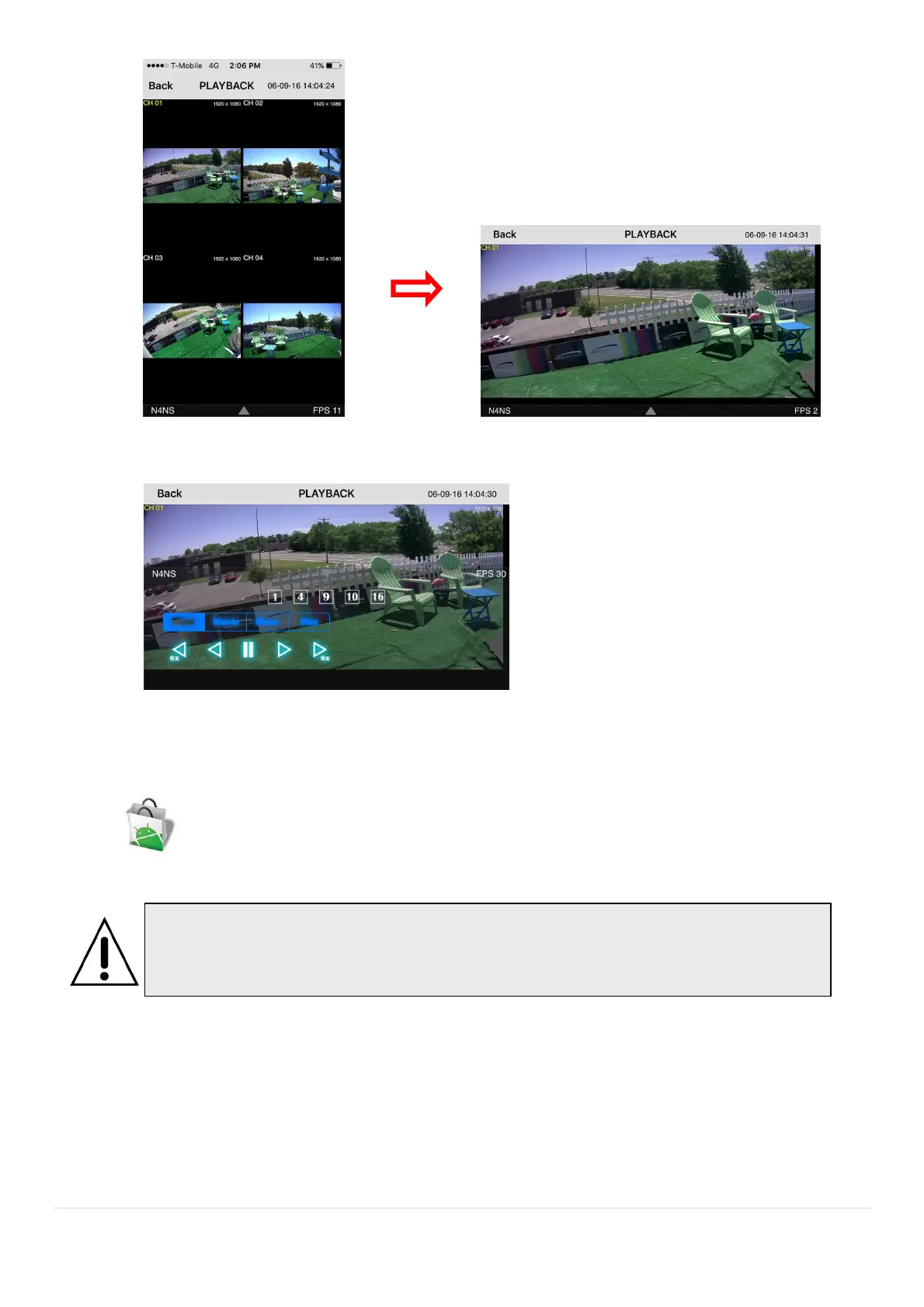 1. Open the installed “Speco Player” App and select the “Live view / Playback”. Then click the menu button of