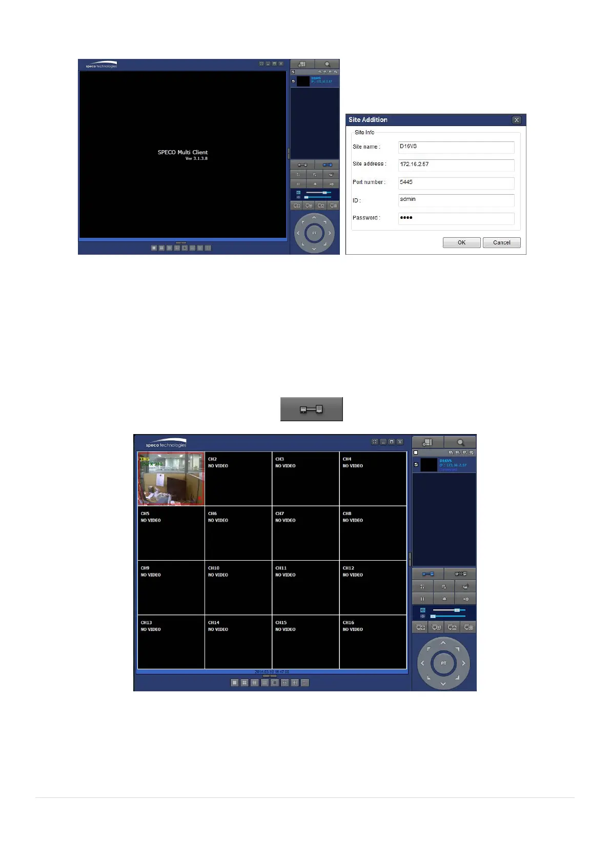 10. Input Site Name, Site Address (IP address), Port No., and Password on the connect window.