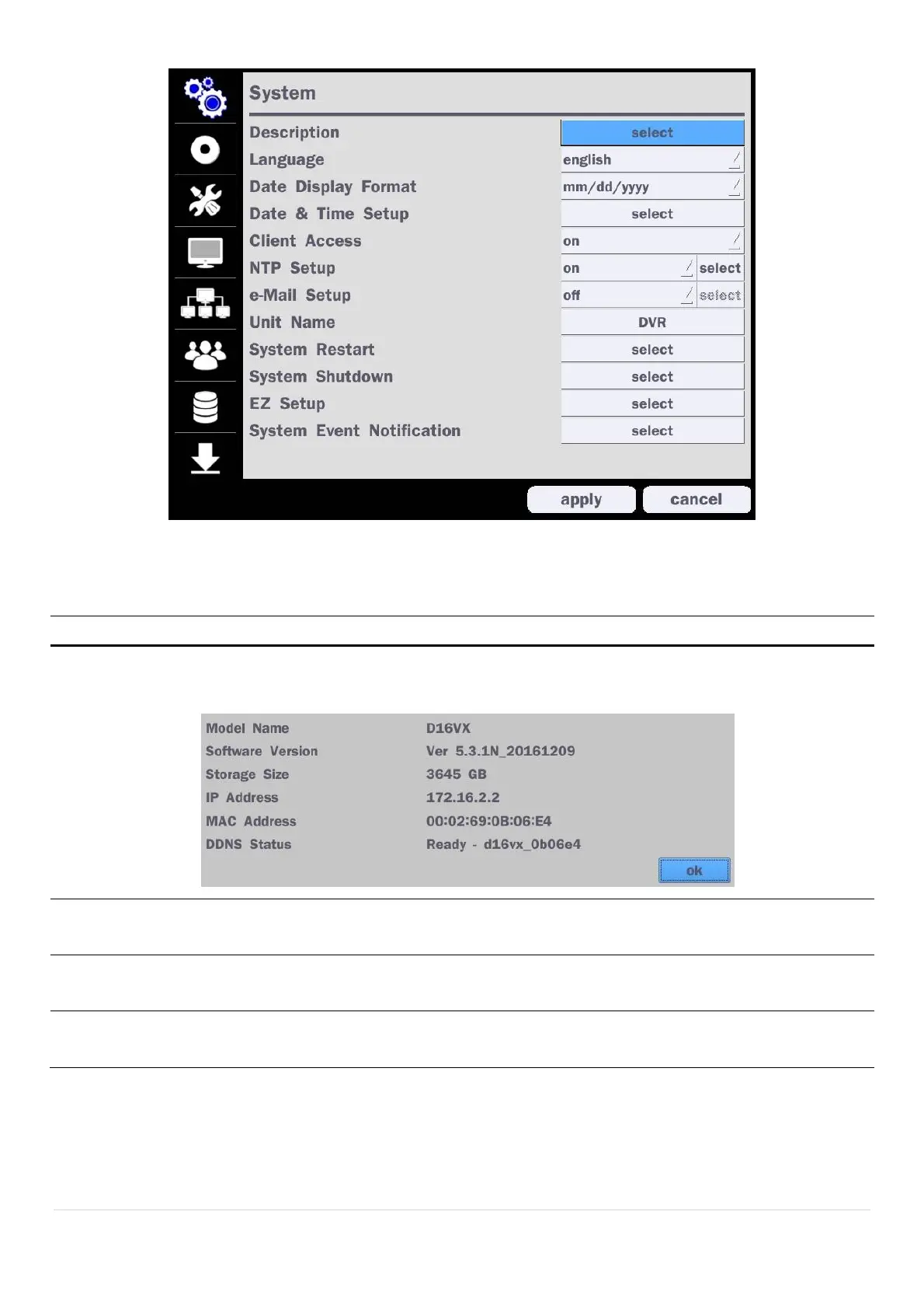 Description Press “select” to view the system information. (Software Version, Storage Size, IP