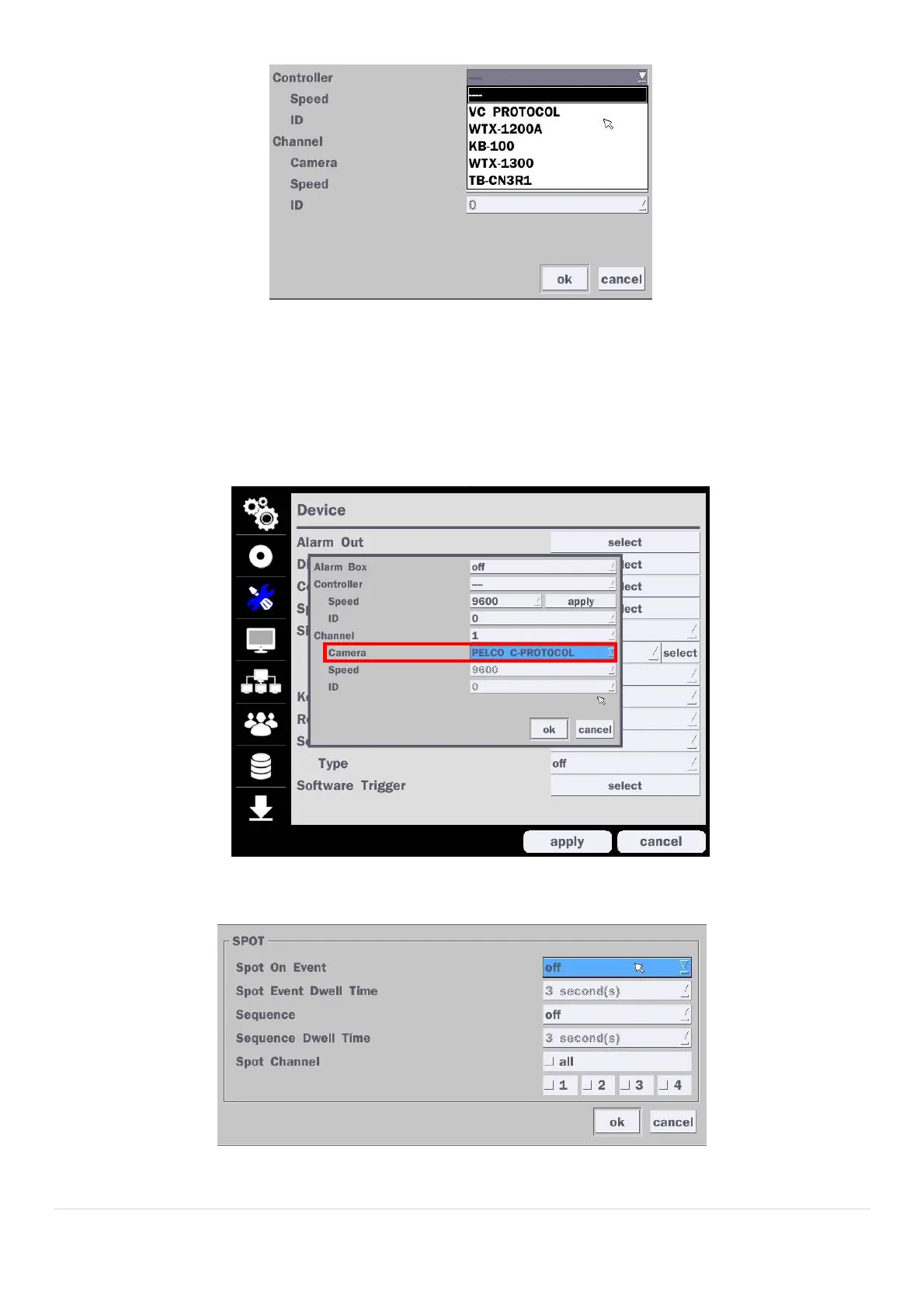 - How to set (Setup > Device > PTZ & Controller > PELCO C-PROTOCOL)