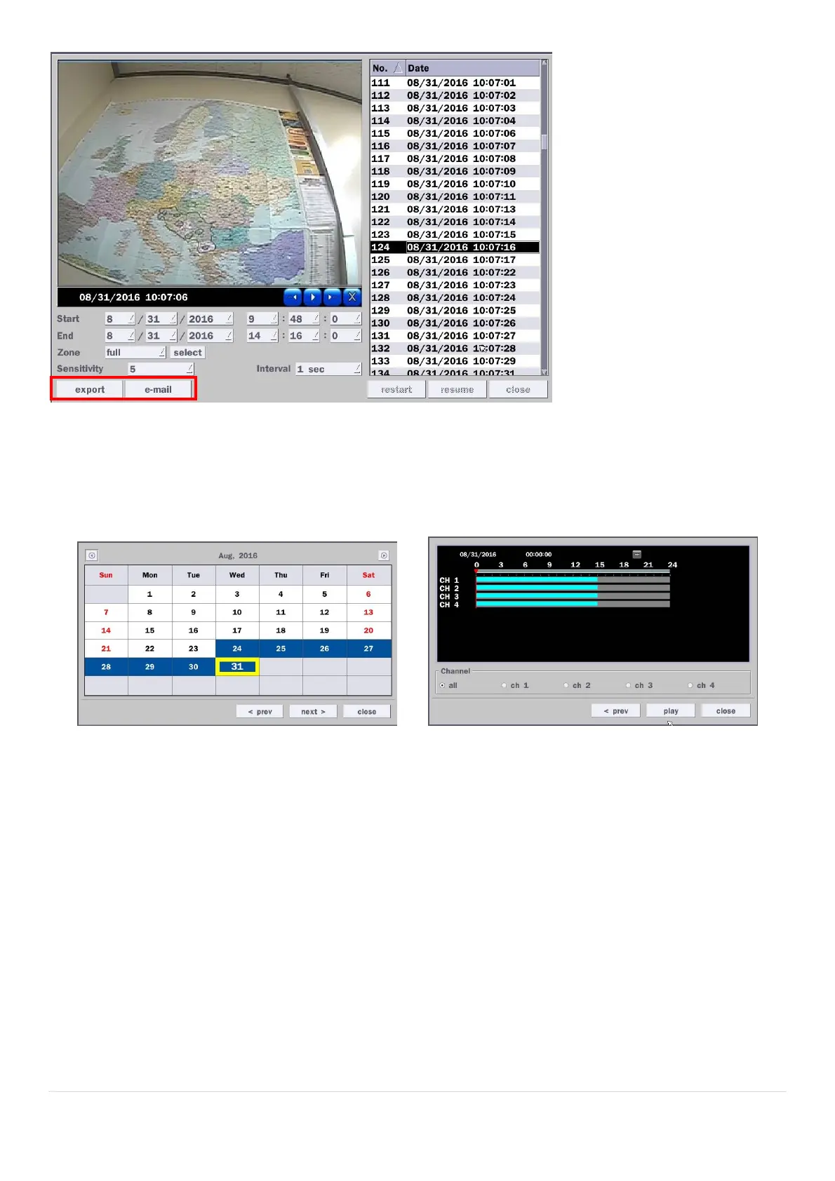 The Calendar Search window is used to find the stored video by using the time line bar.