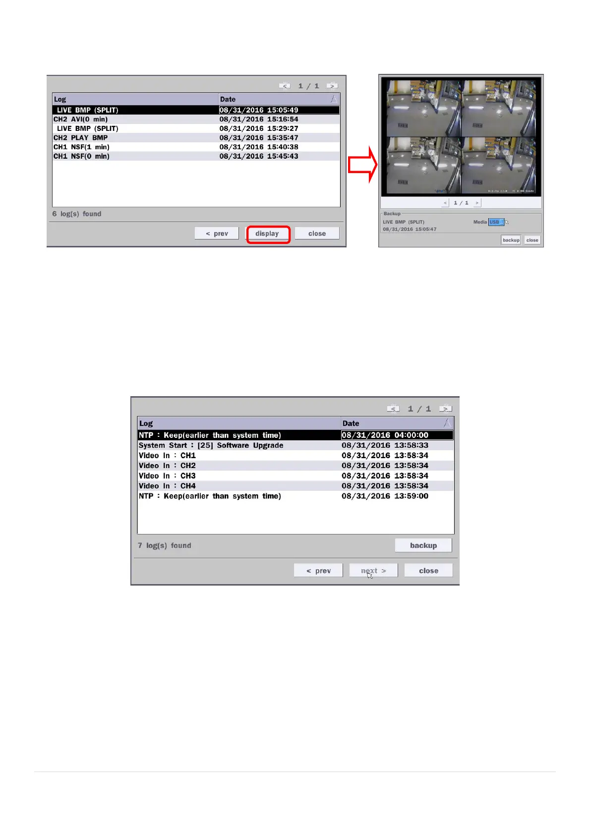 date and then the archived data will be displayed. Press the Display button to view the still image or the first