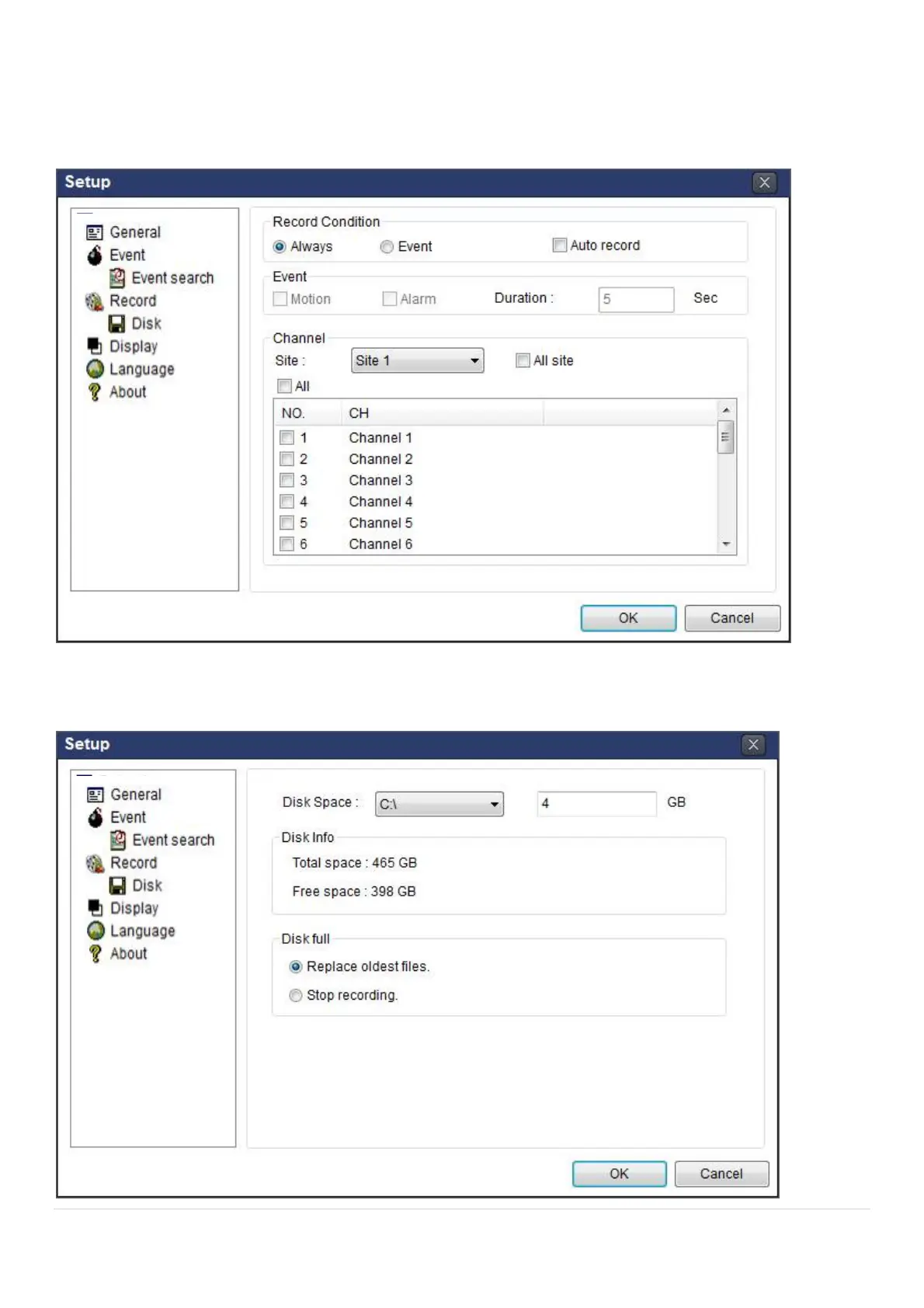 Record Setup: You can set the recording conditions as the following; Always, Event, or Auto record. And