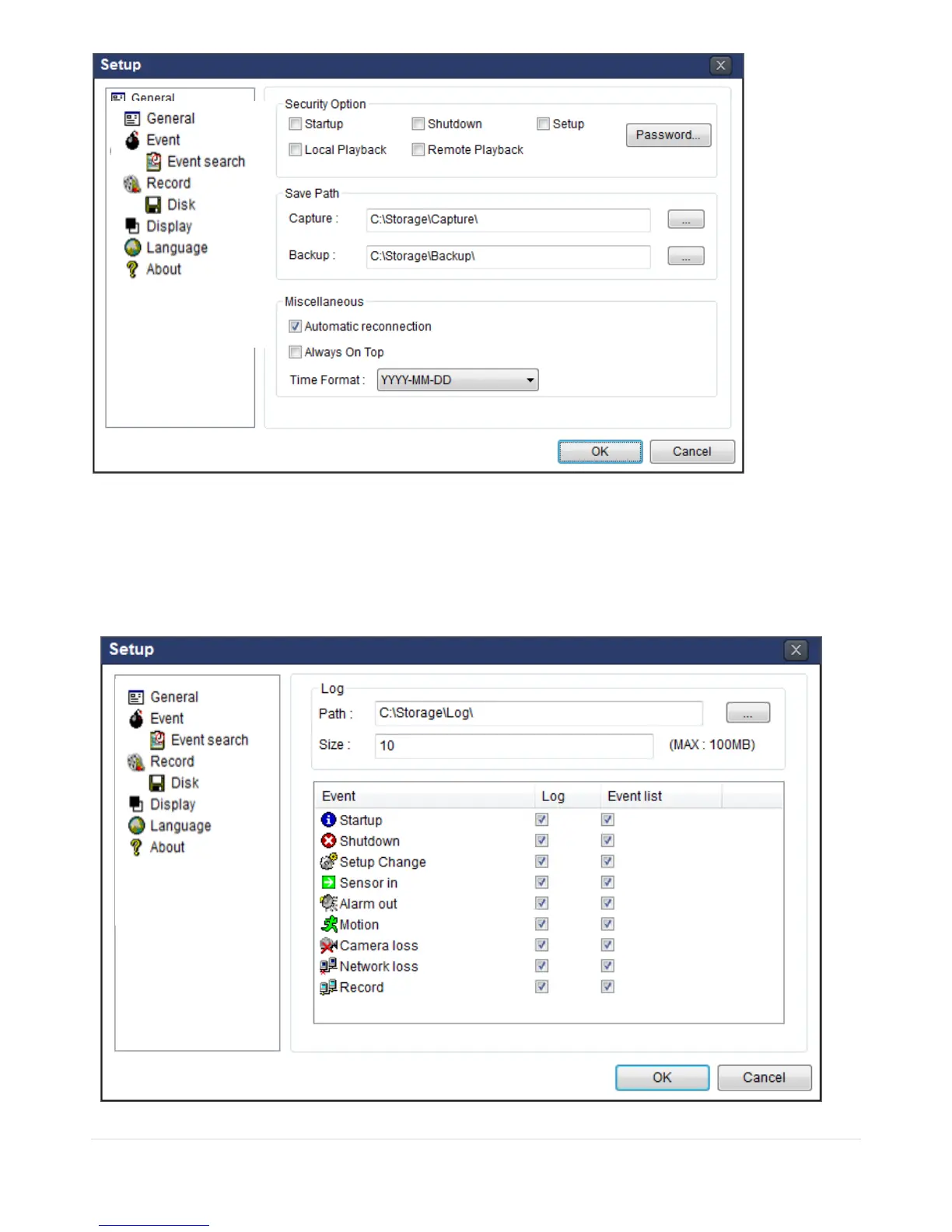 Event Log: Specify the location to save event logs and select event to archive.