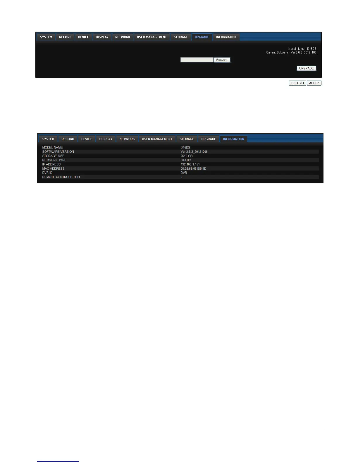 Upgrade: Select UPGRADE to upgrade the firmware of the DVR.