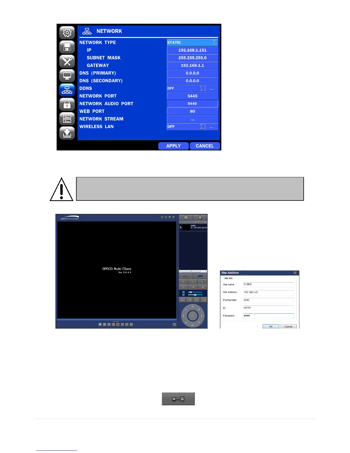 7. Input Site Name, Site Address (IP address), Port No., and Password on the connect window.