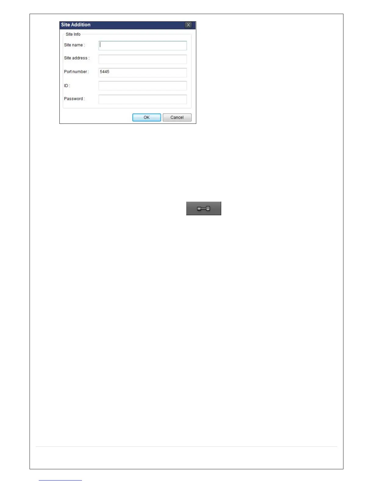 4. Input Site Name, Site Address (IP address), Port Number, and Password on the connect window.