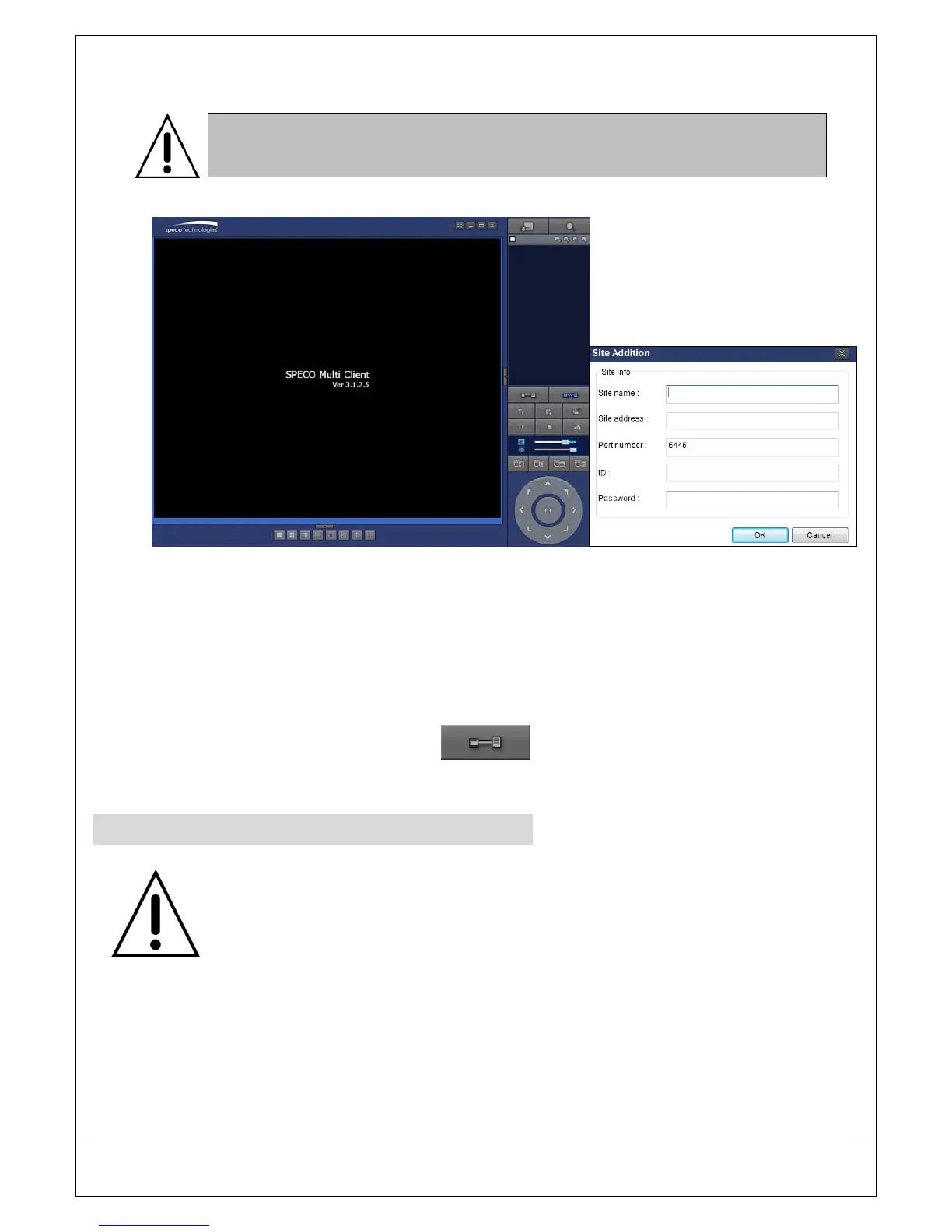 7. Input Site Name, Site Address (IP address), Port No., and Password on the connect window.