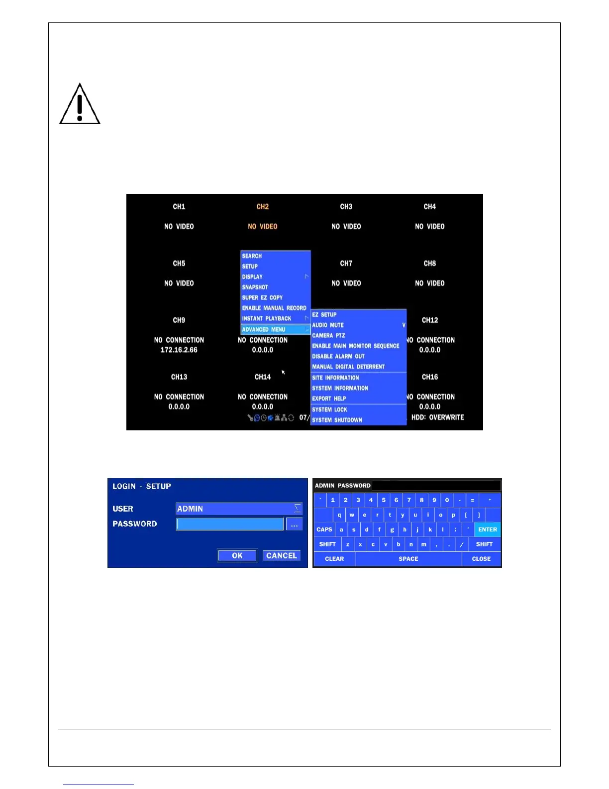 When the DVR prompts the LOG-IN window, enter the PASSWORD using the virtual keyboard, or the front