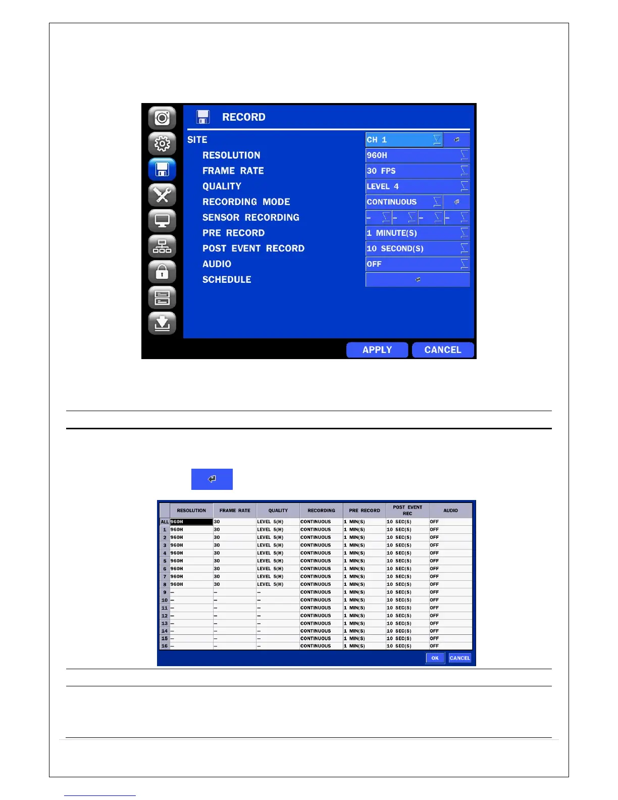 RESOLUTION Select 960H, D1 or CIF for analog cameras using the mouse or the remote control.