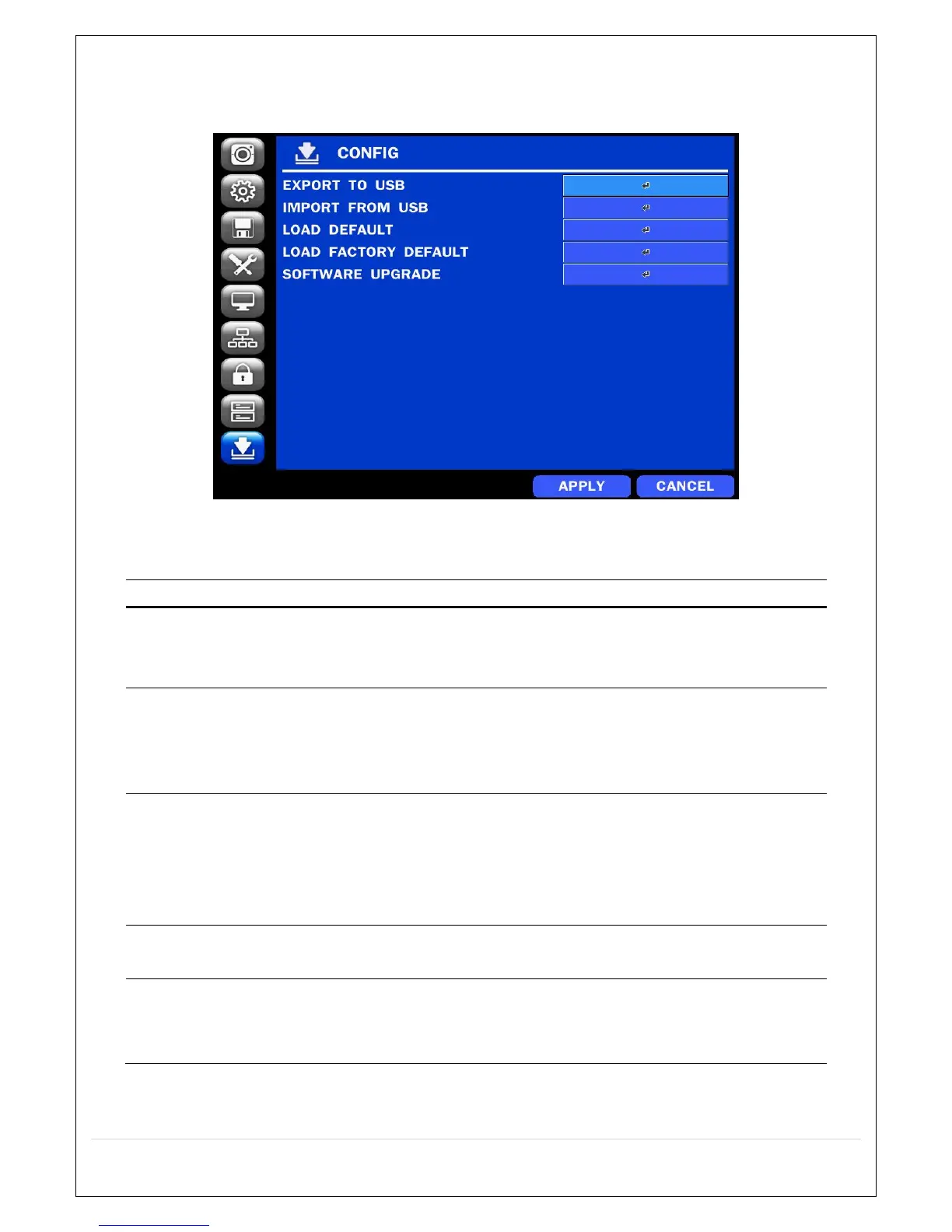 In the SETUP menu, select the CONFIG tab. Then, the configuration menu is displayed as pictured below.