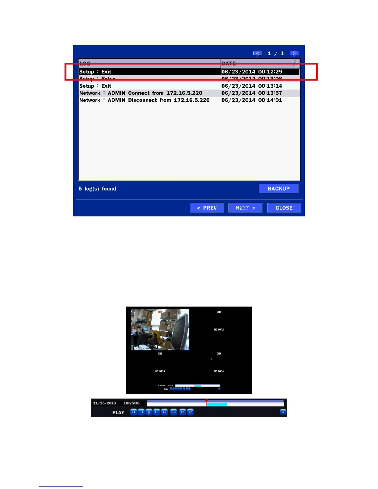 During playback of a recorded event, the mode changes from SEARCH to PLAY. While in PLAY mode, you