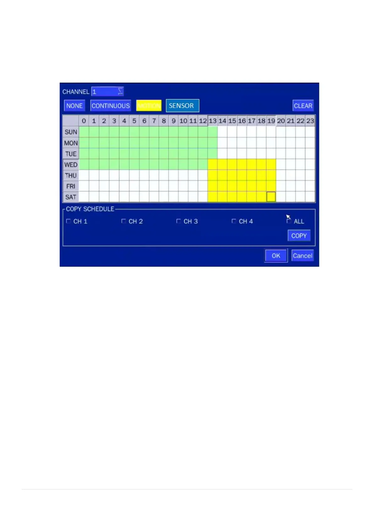 Select CHANNEL > select NONE, CONTINUOUS or MOTION > HIGHLIGHT AREA