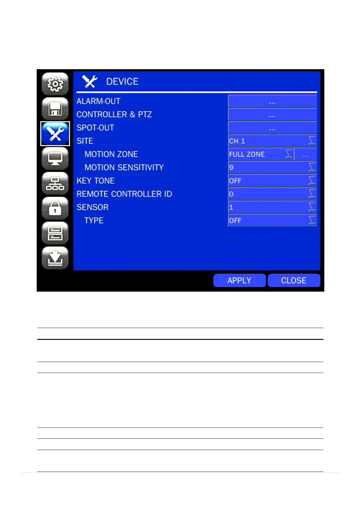 Table 4.4.1. Menu Items in DEVICE Setup Screen