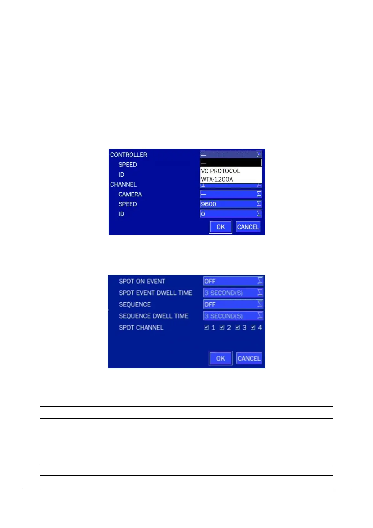 Use the PTZ setup screen to select the following options for the camera PTZ controller: