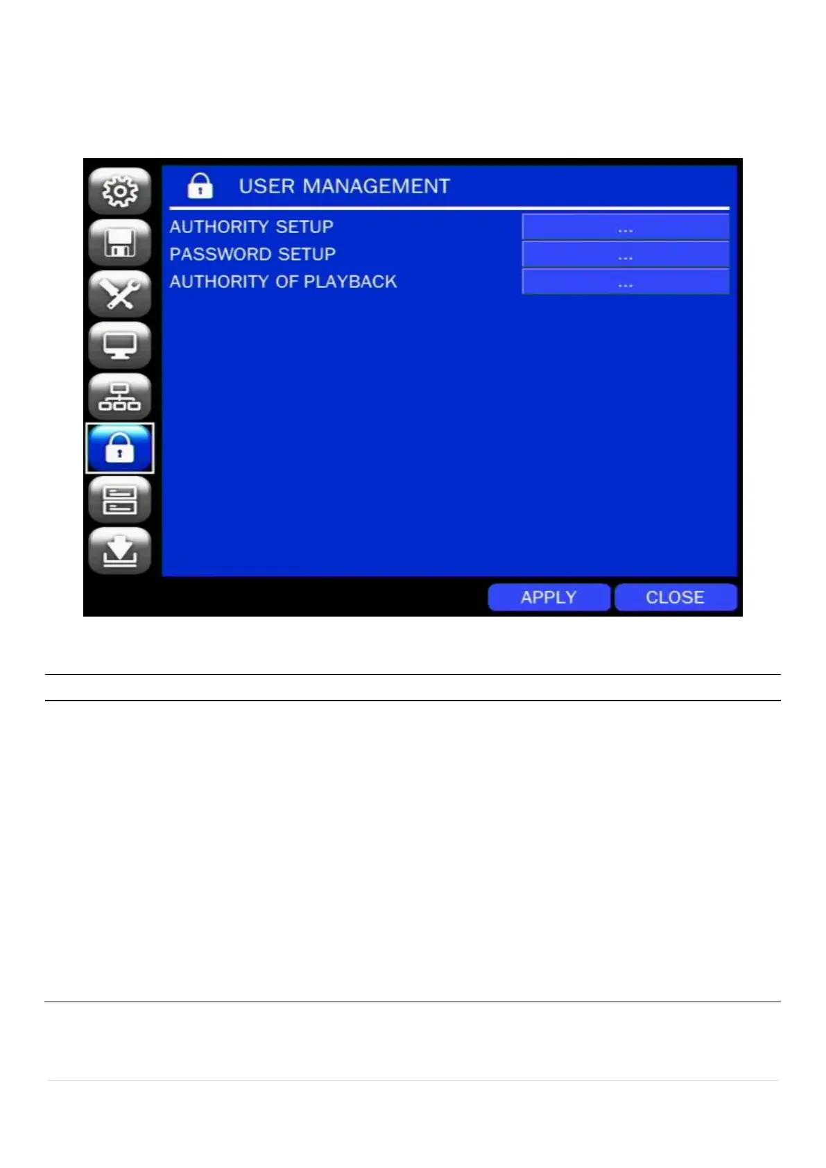 Table 4.7.1. Menu Items in USER MANAGEMENT Setup Screen
