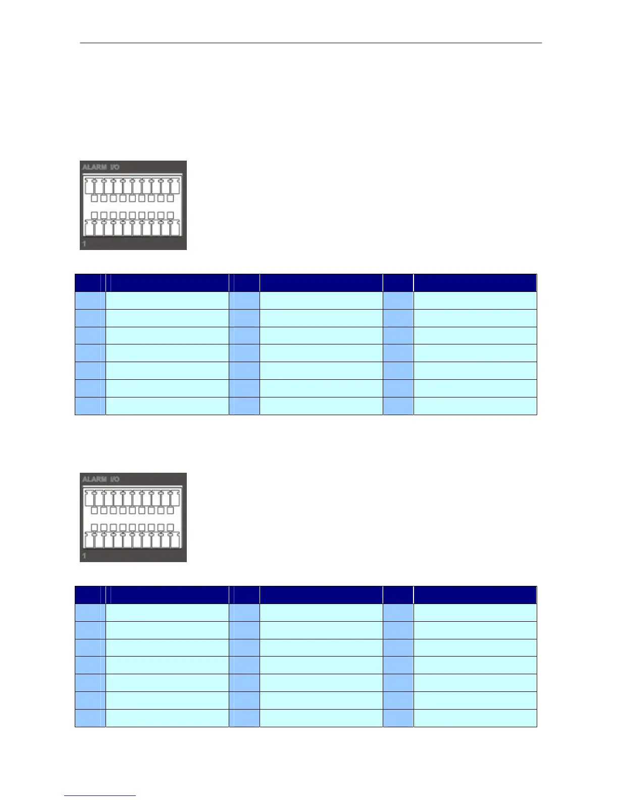 The tables below list the pin definitions of alarm I/O located on the rear panel of the