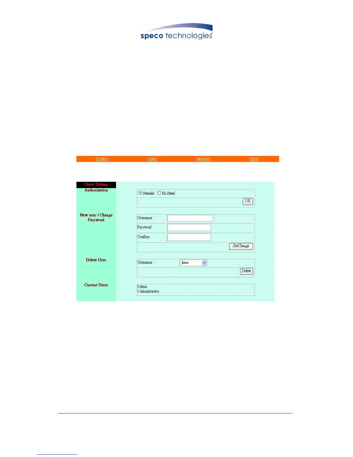 “Password”. To disable user authorization function, select item “No Need”.