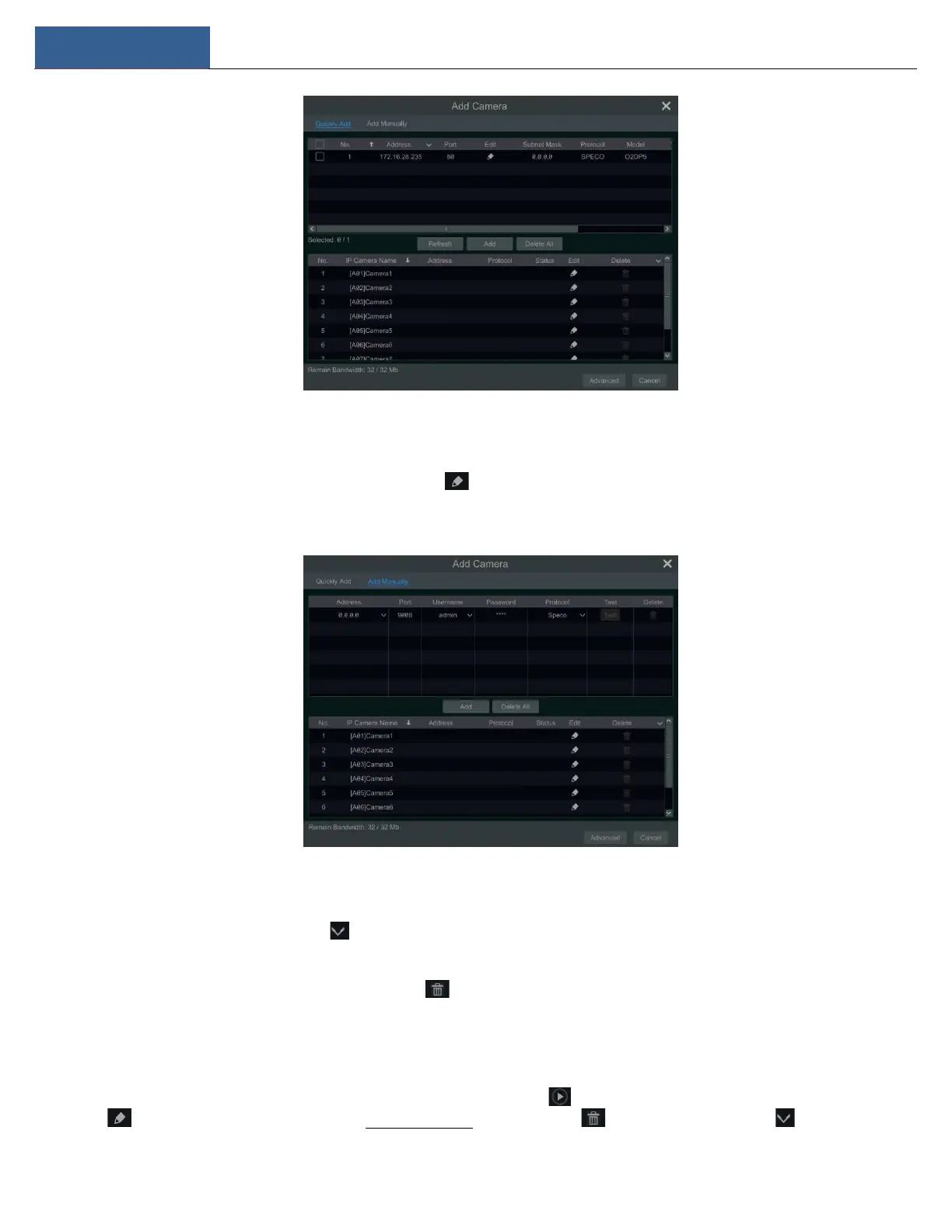 Click to edit the camera (see Add camera in 3.1 Startup Wizard for details). Click to delete the camera. Click in the “Operation”