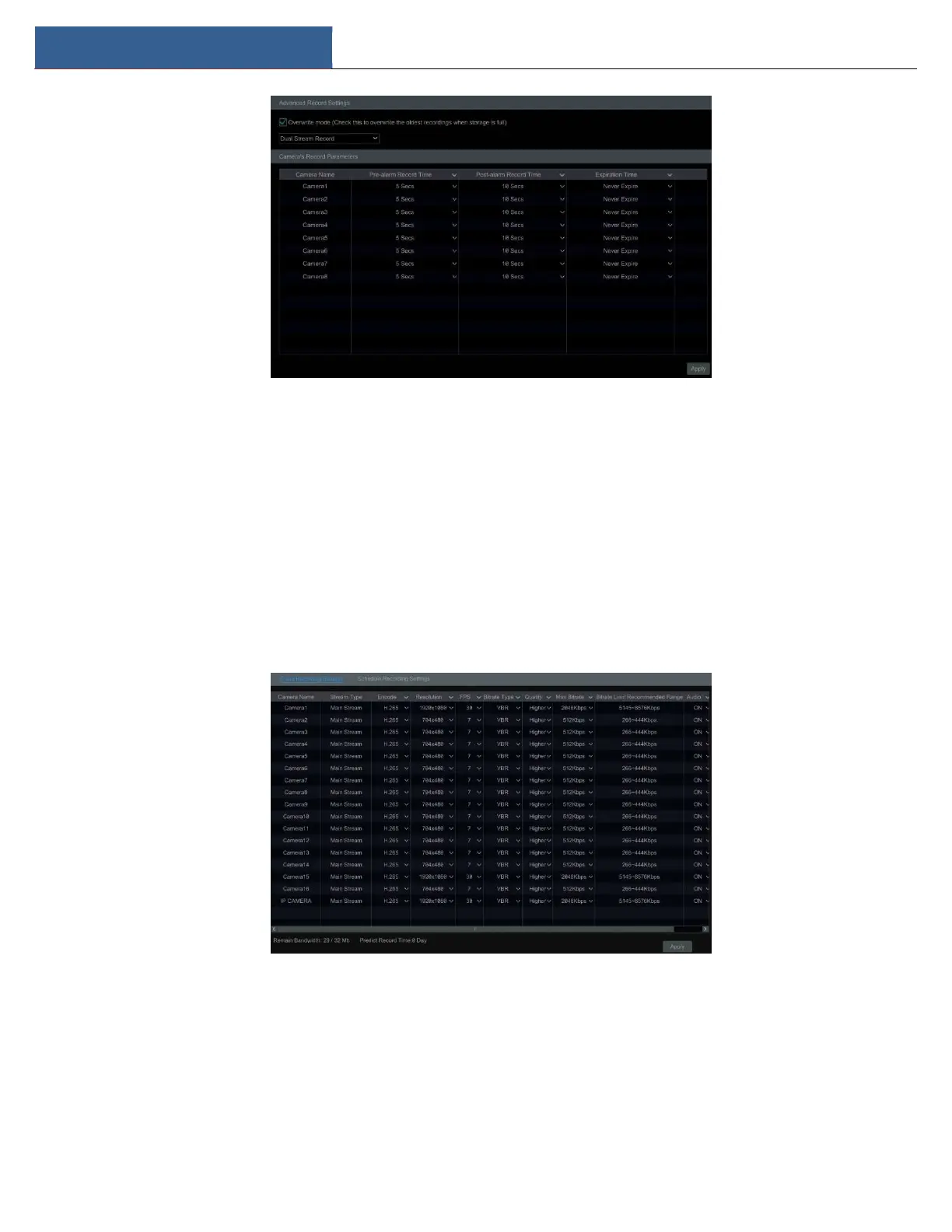 quality, max bitrate and audio of the main stream for each camera in “Event Recording Settings” and “Schedule Recording Settings” interfaces. Click