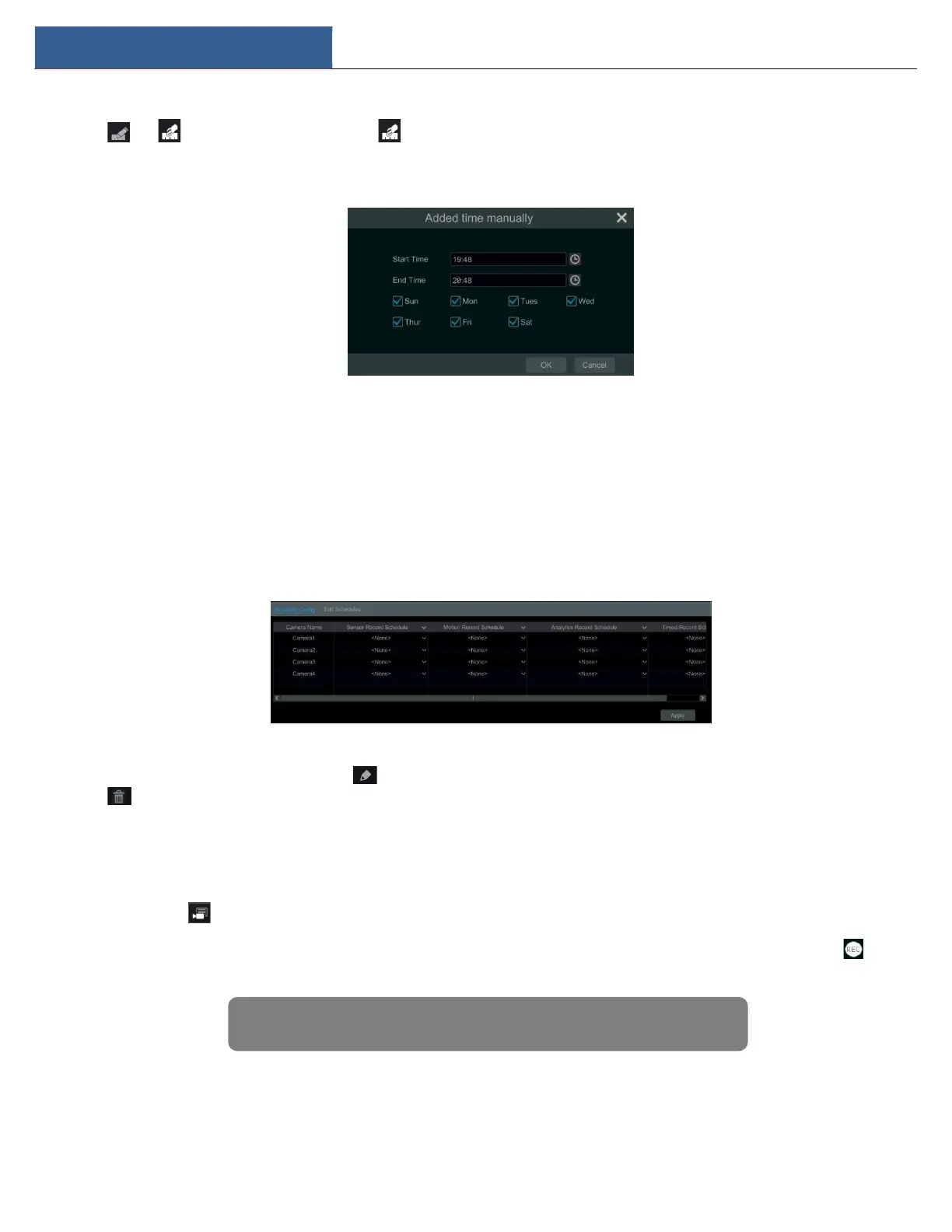Click or and then click “Manual” beside to set the week schedule. Refer to the picture below. Set the start and end time, check