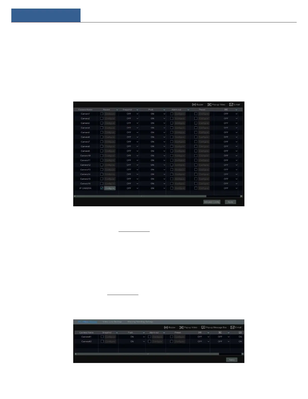 ② Enable or disable “Snapshot”, “Push”, “Alarm-out”, “Preset”, “Buzzer”, “Pop-up Video”, “Pop-up Message Box” and “E-mail”. The IPC Offline