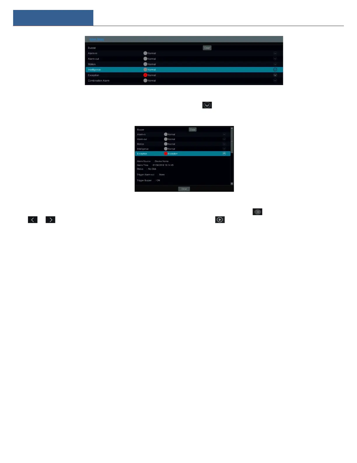 / to view the exception alarm information in the previous/next page. Click to play the alarm record.