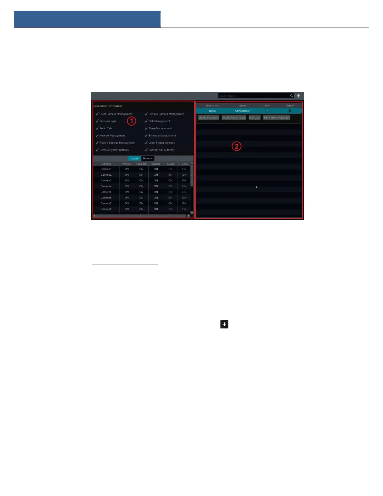 Area ① displays the user permissions. Area ② displays the user list. Click the user in the list to display its user permissions in area ①.