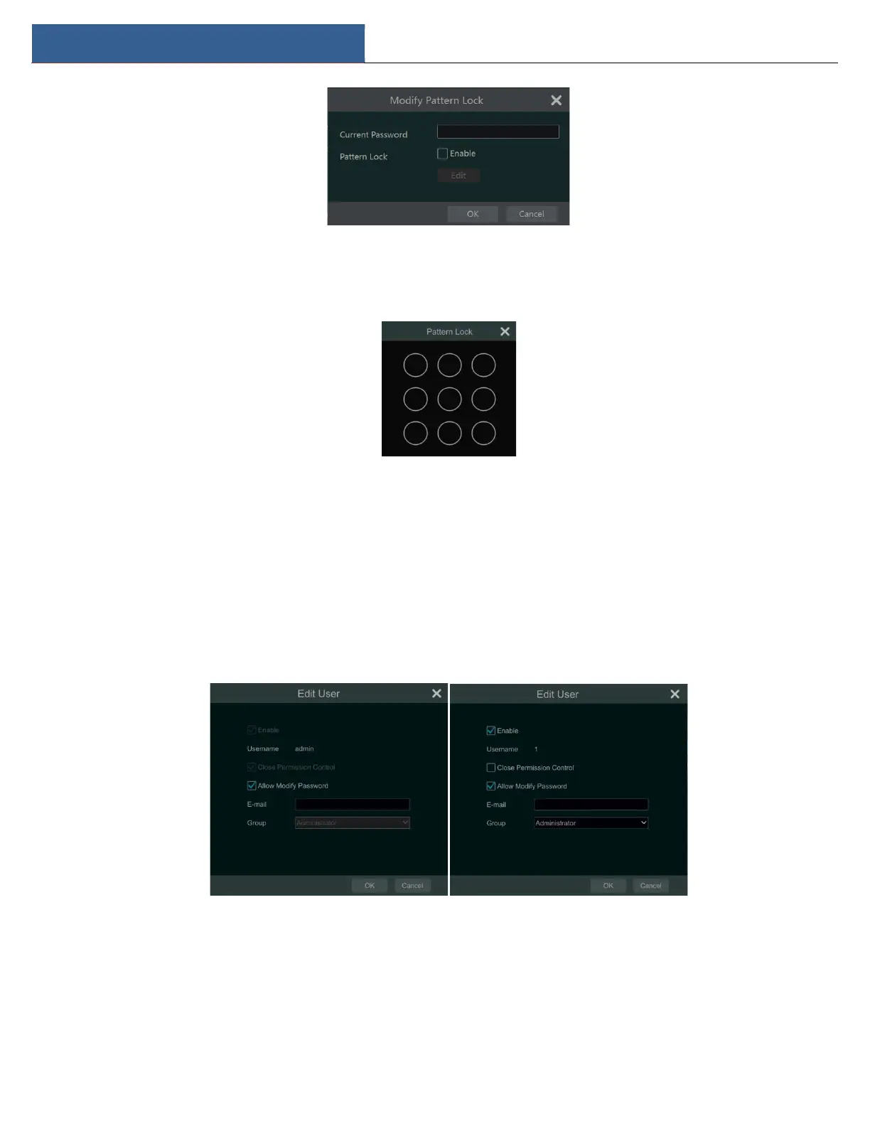 Click “Edit User” to pop up the window as shown below. Admin is enabled, its permission control is closed and permission group cannot be