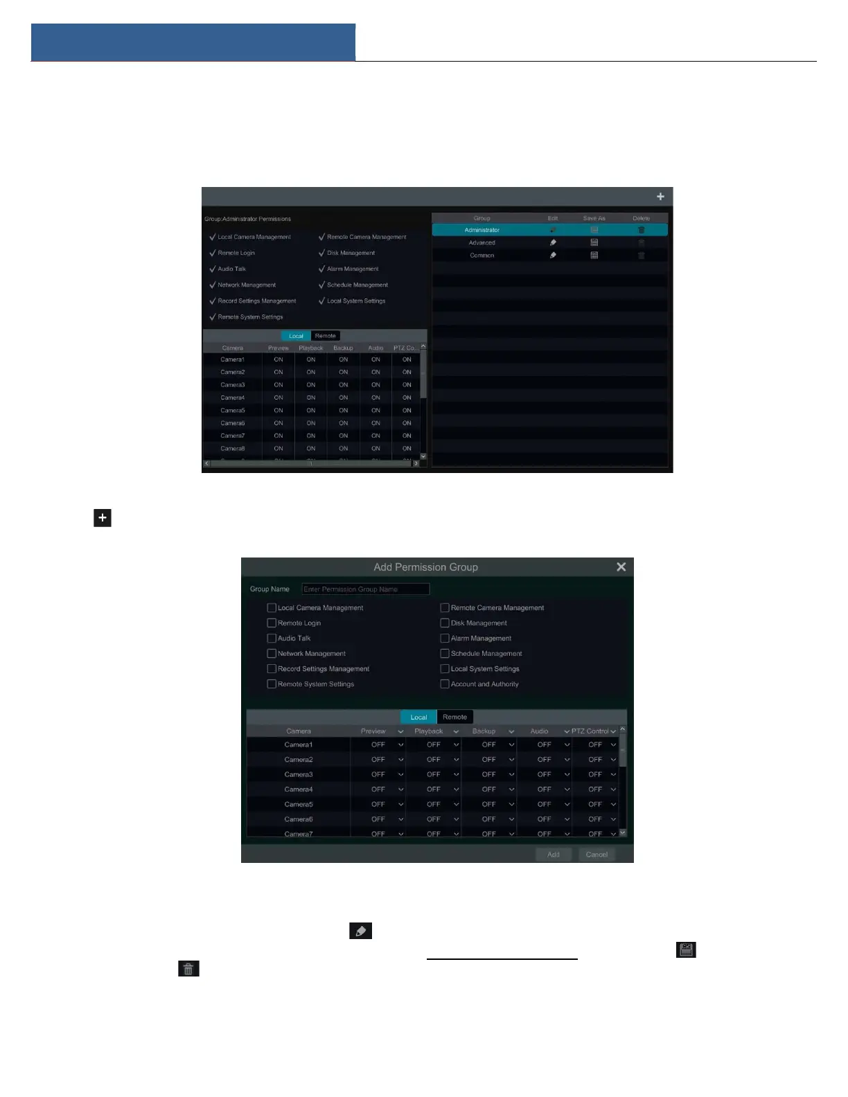Click to add permission group. Set the group name, check the permissions as needed and then set the “Local” and “Remote” permissions.
