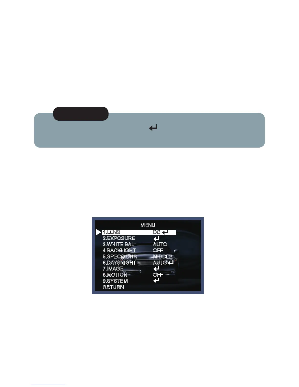 1. Move the triangular indicator to LENS using the Up and Down buttons on the Set Up menu screen.