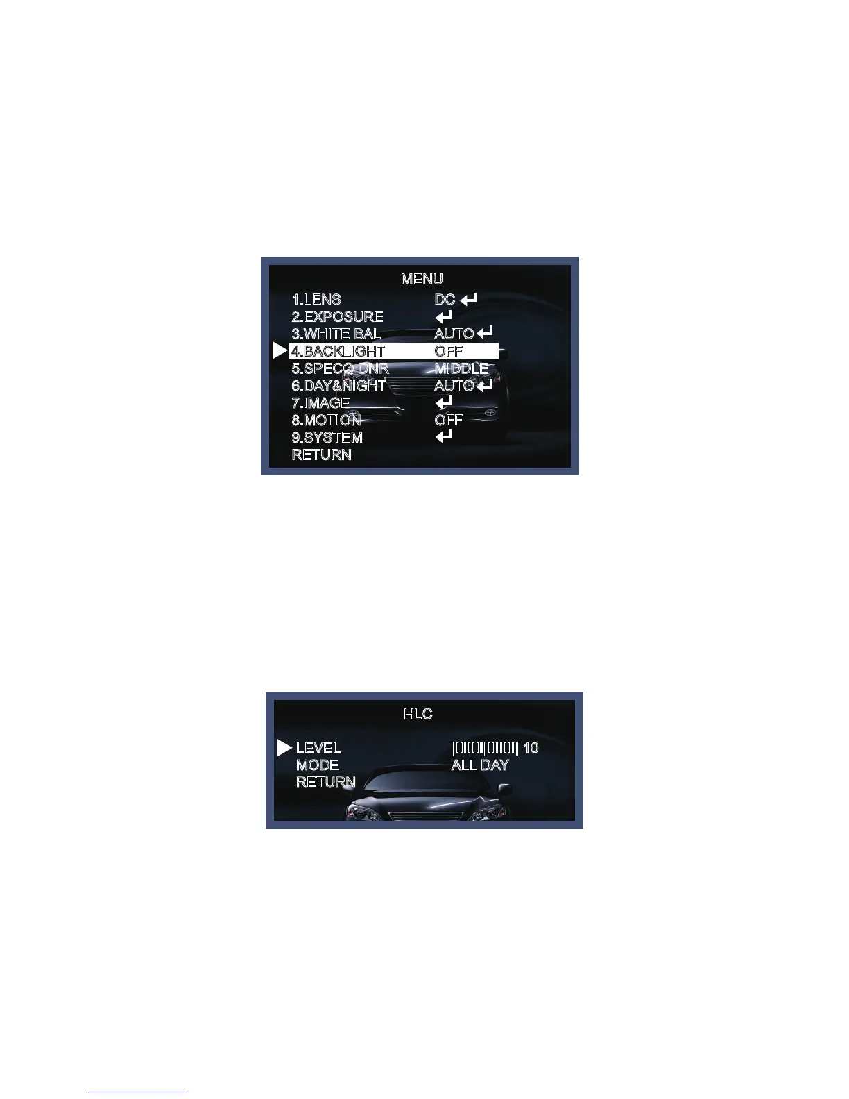 On this menu, backlight image can be compensated by users selecting one of modees.(HLC, BLC, WDR)