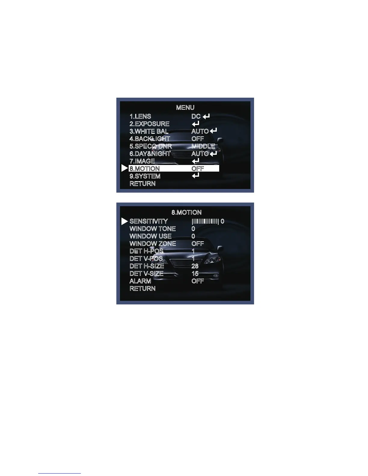- ALARM [ON, OFF] : In motion situation, you can select the detail of option setting.
