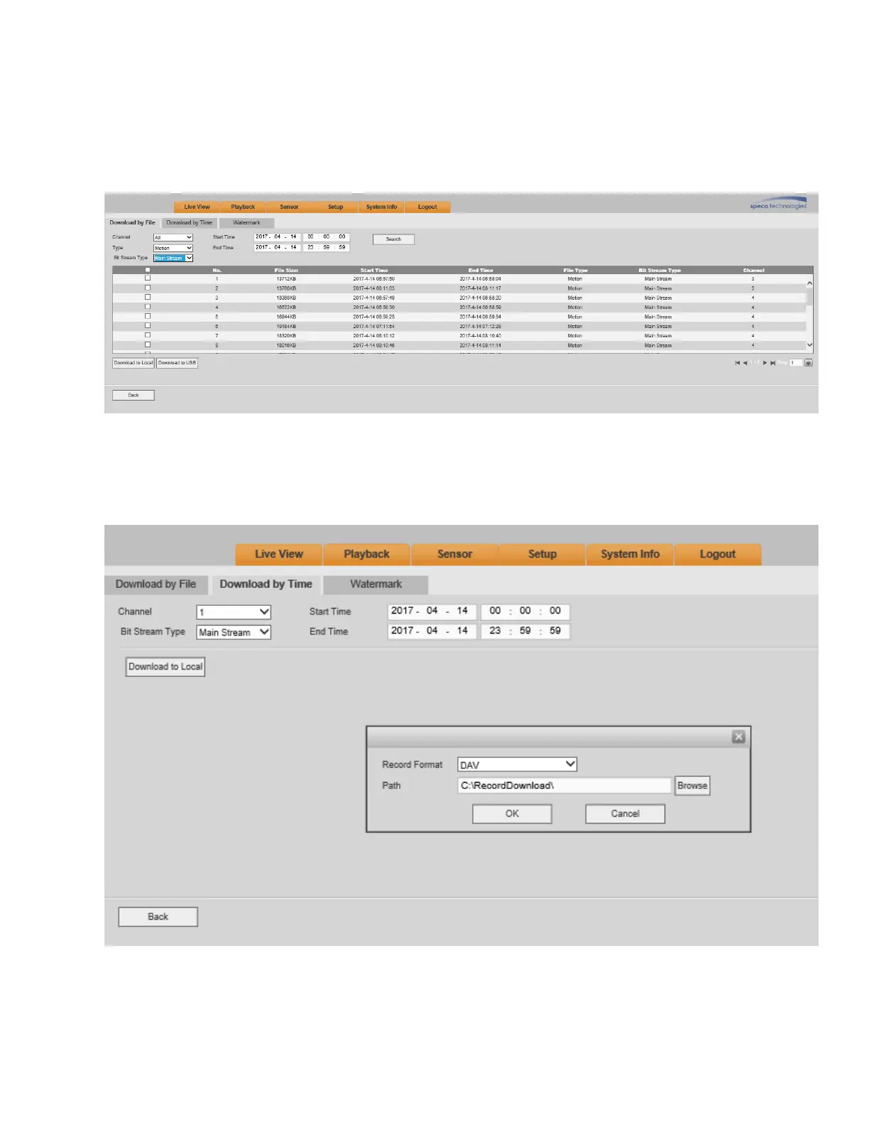 Select channel, recording type, and the start time and end time. Click the Search button to show the results.