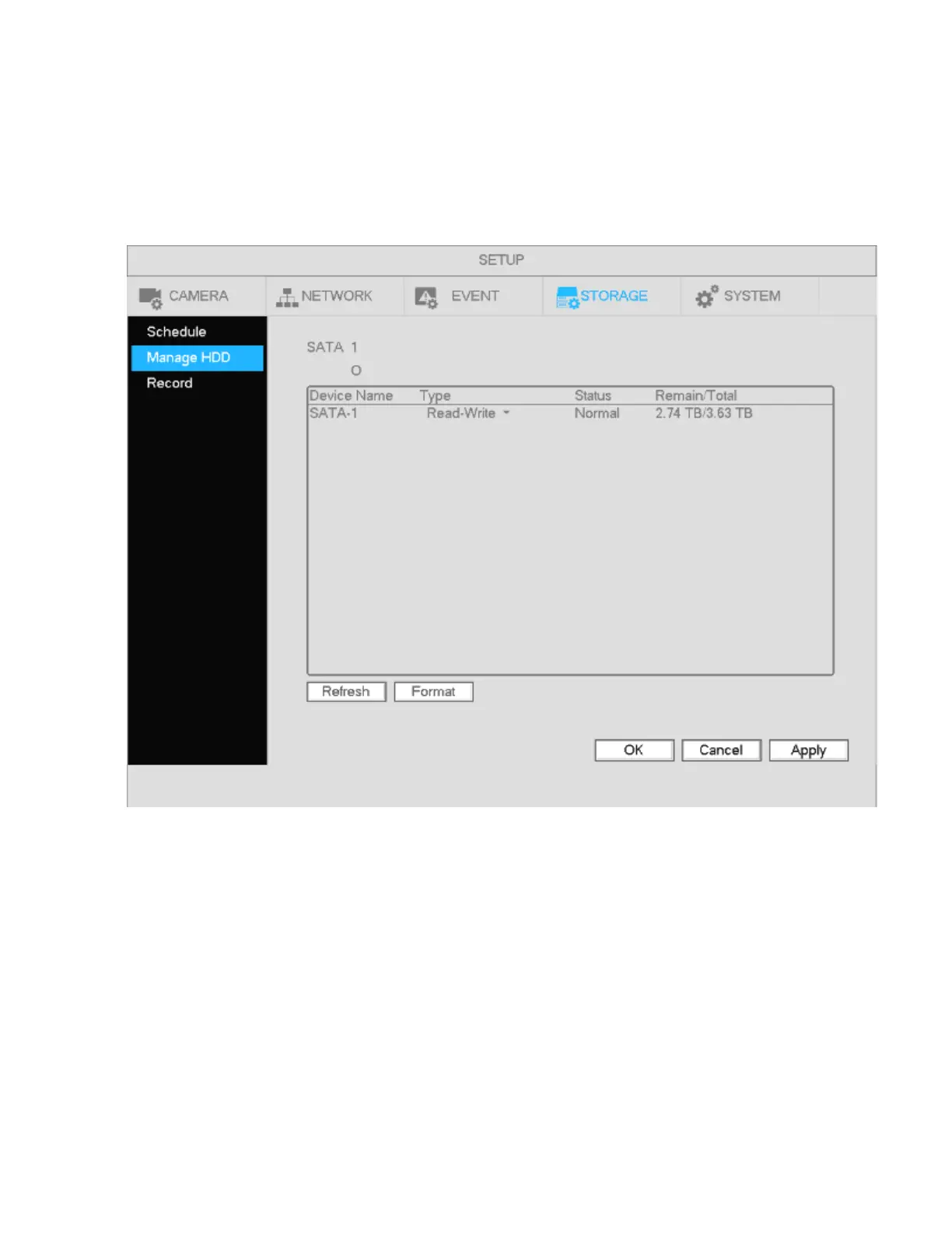 a) Go to Main menu->Setup->Storage->Manage HDD shown in Figure 4-76.