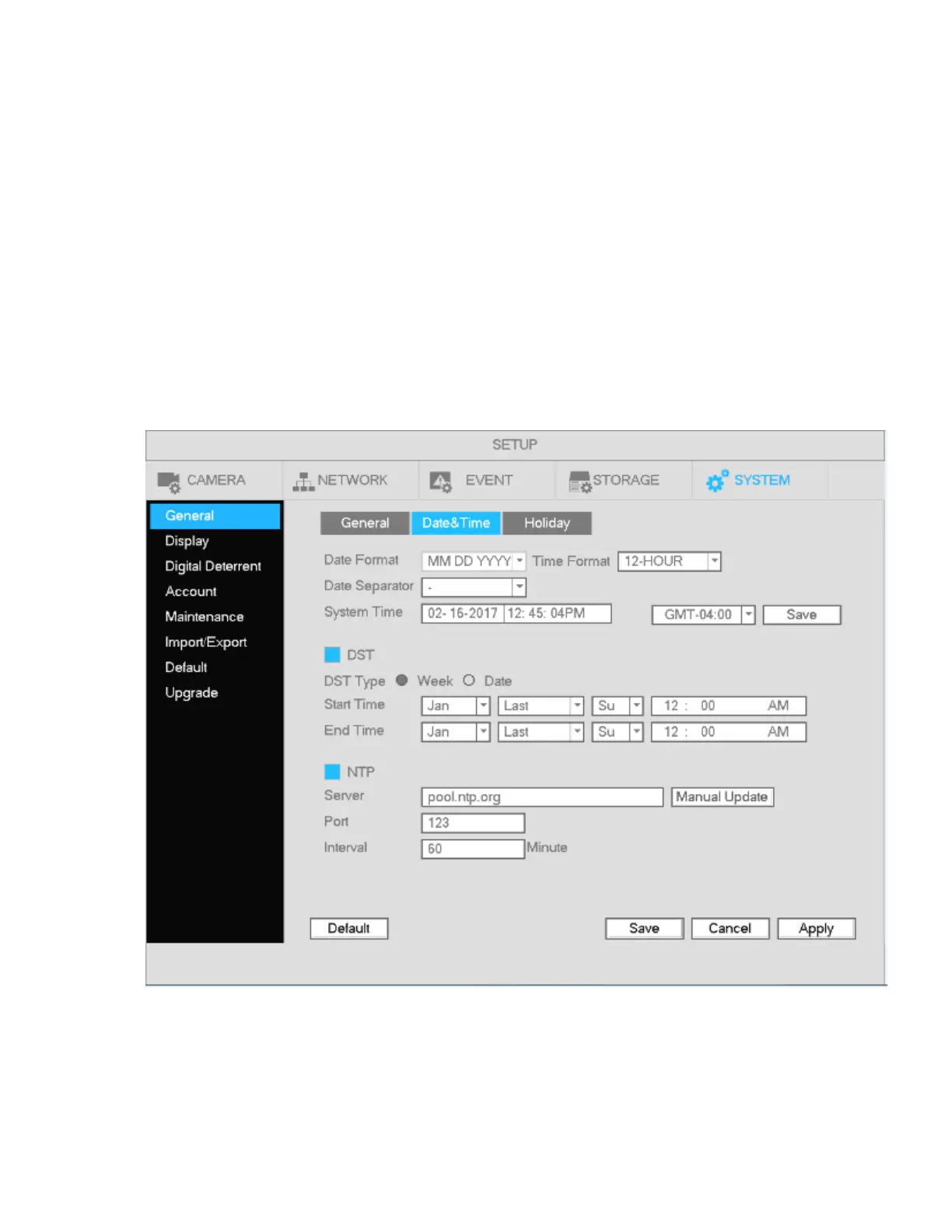 DST: Set the start and end dates for Daylight Saving Time. DST must be enabled to use this function.