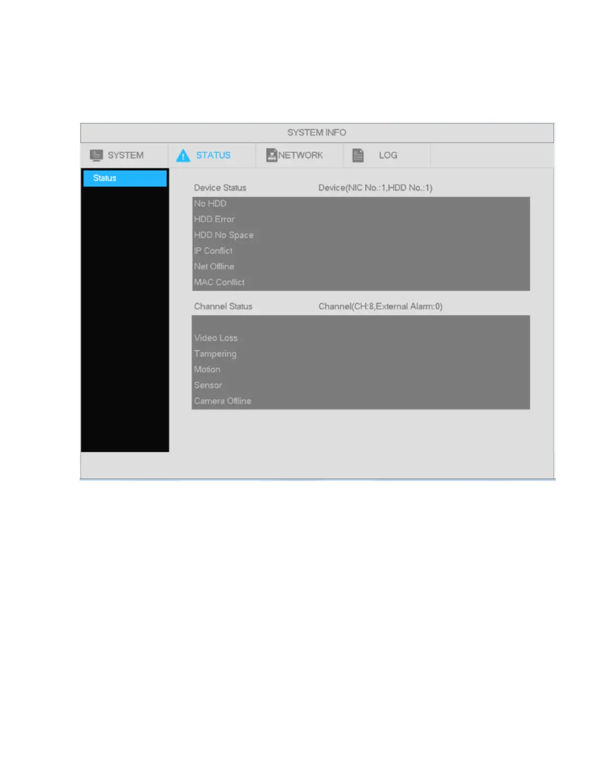 Go to Main Menu->System Info->Status to view the channel status of the remote device, connection log, etc.