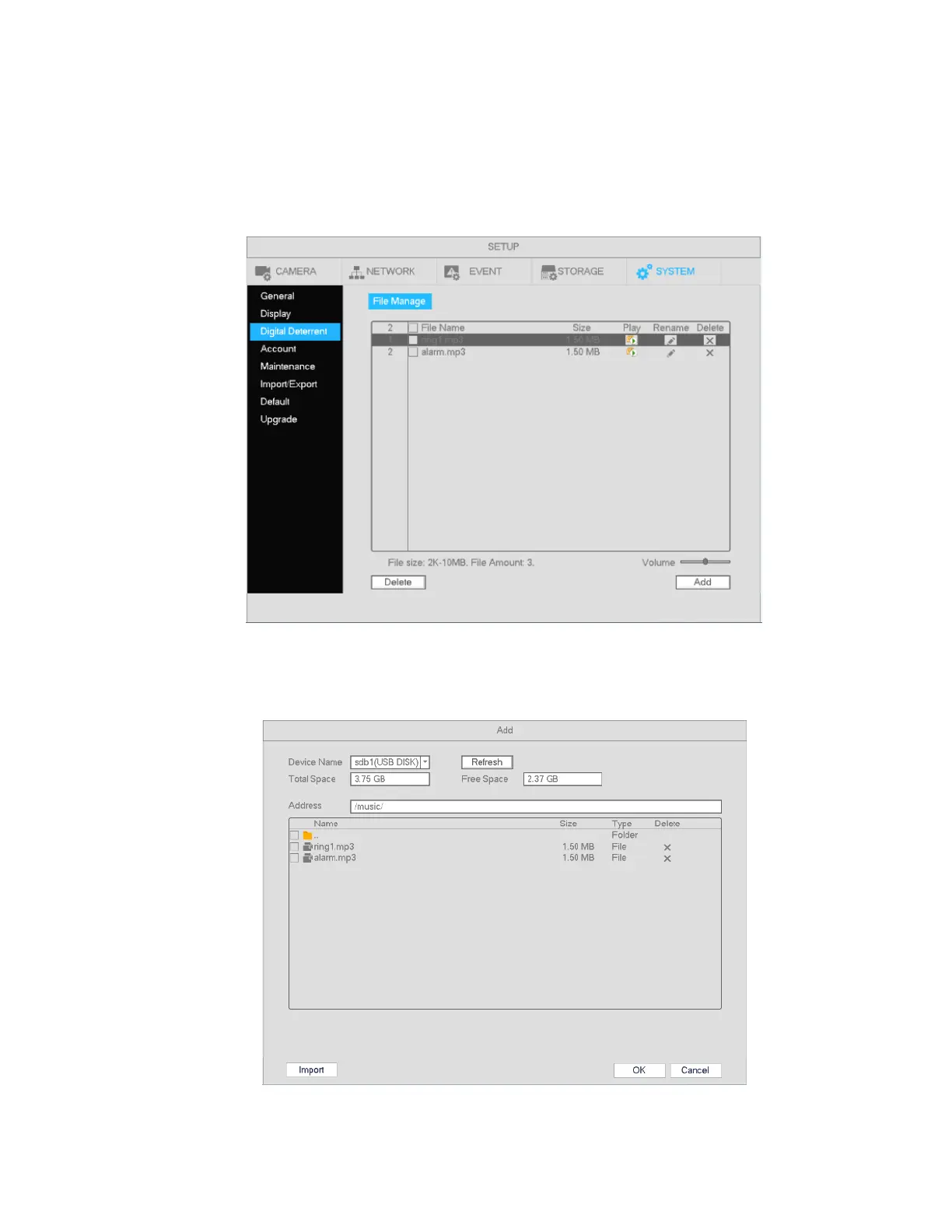 Click the Add button, to add an audio file via USB. Supported audio formats are MP3 and PCM. See Figure