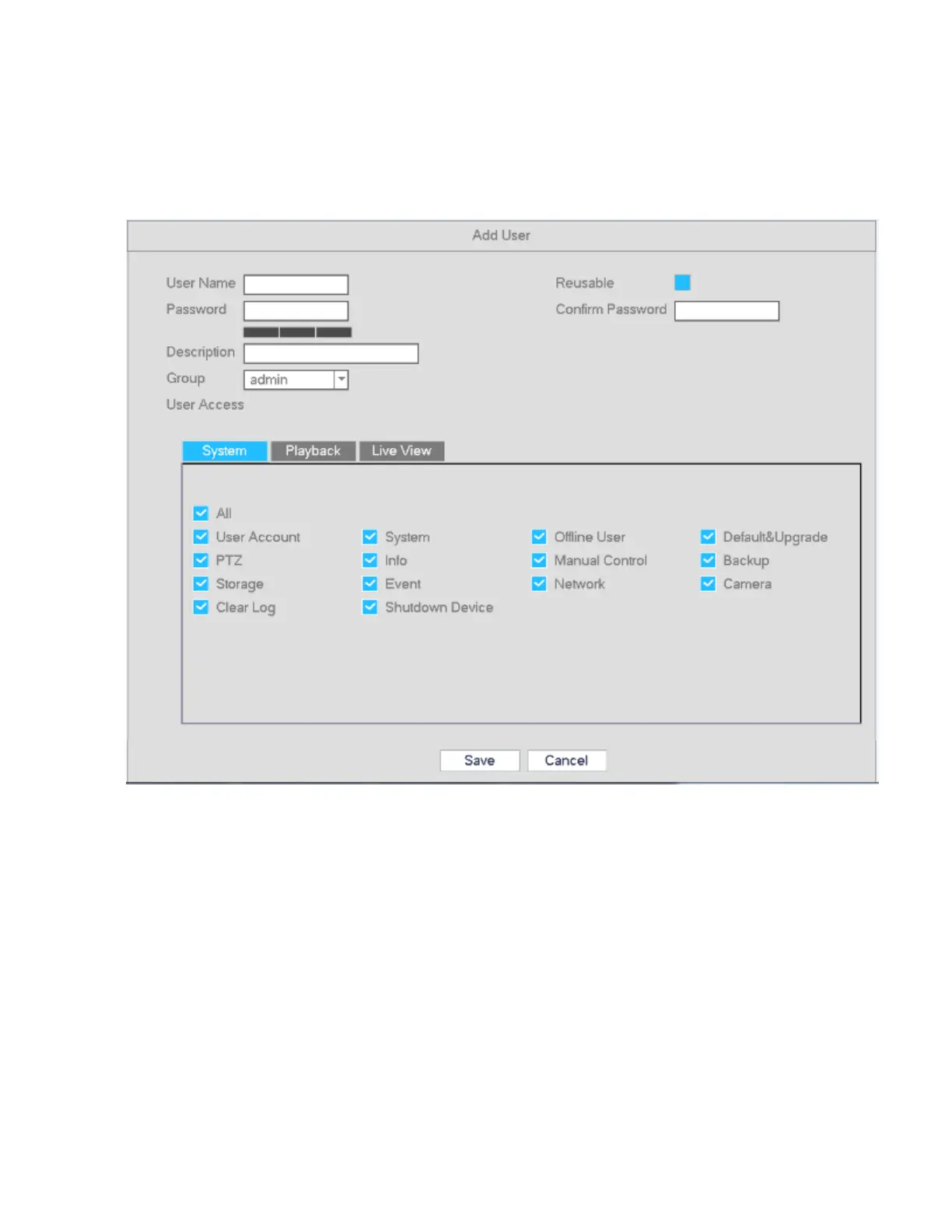 Enter the user name, password, and select the group it belongs to from the dropdown list.