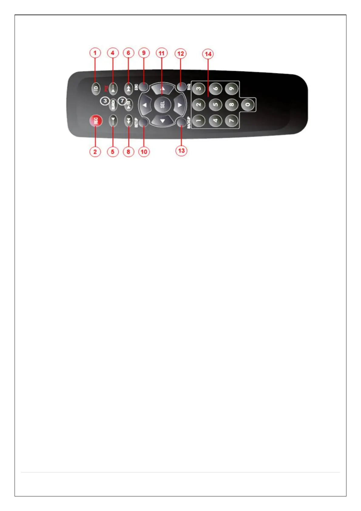 ⑭ 0~9: Used to select channel (1,2,3,..) or to setup a NS Remote ID.