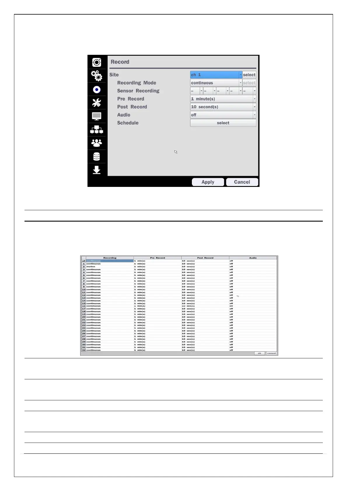 Pre Record Enable/disable pre-event recording. Pre-event recording time is up to 20 minutes.