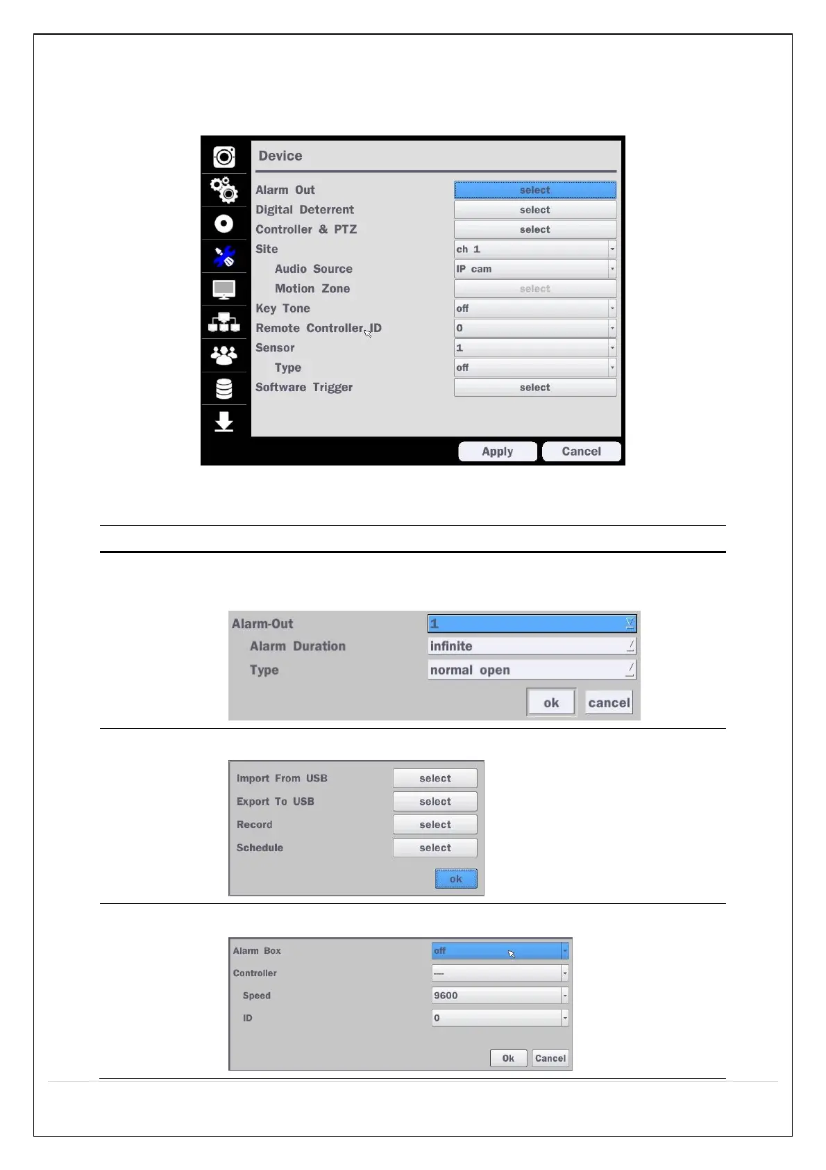 Set the Alarm Box, PTZ baud rate, protocol, and ID.