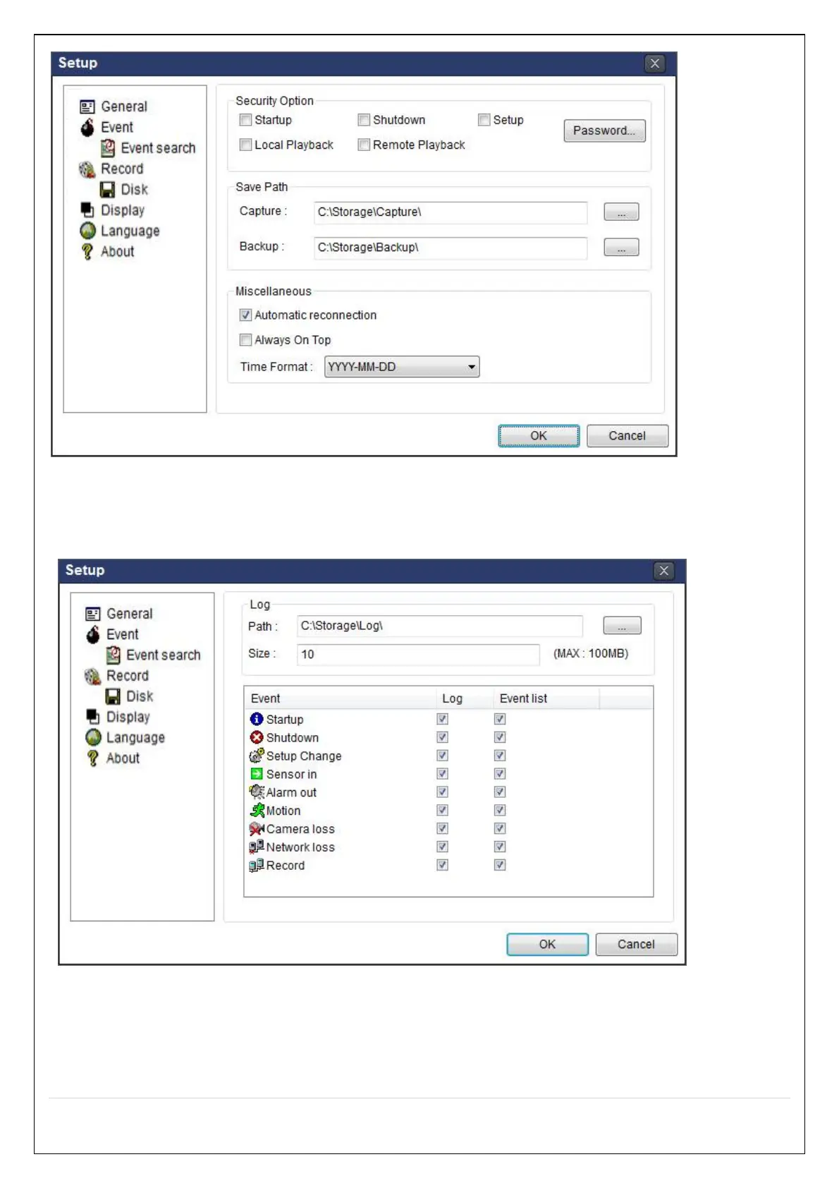 Event Log: Specify the location to save event logs and select event to archive.
