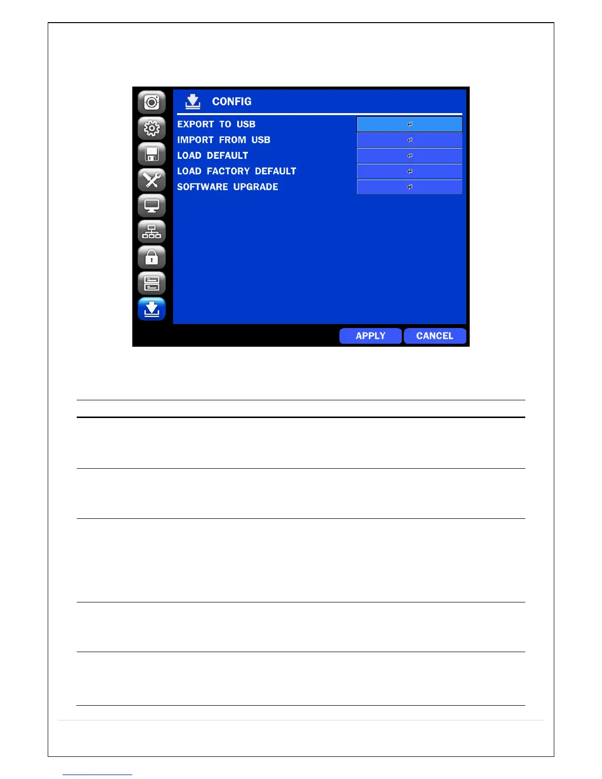 In the SETUP menu, select the CONFIG tab. Then, the configuration menu is displayed as pictured below.