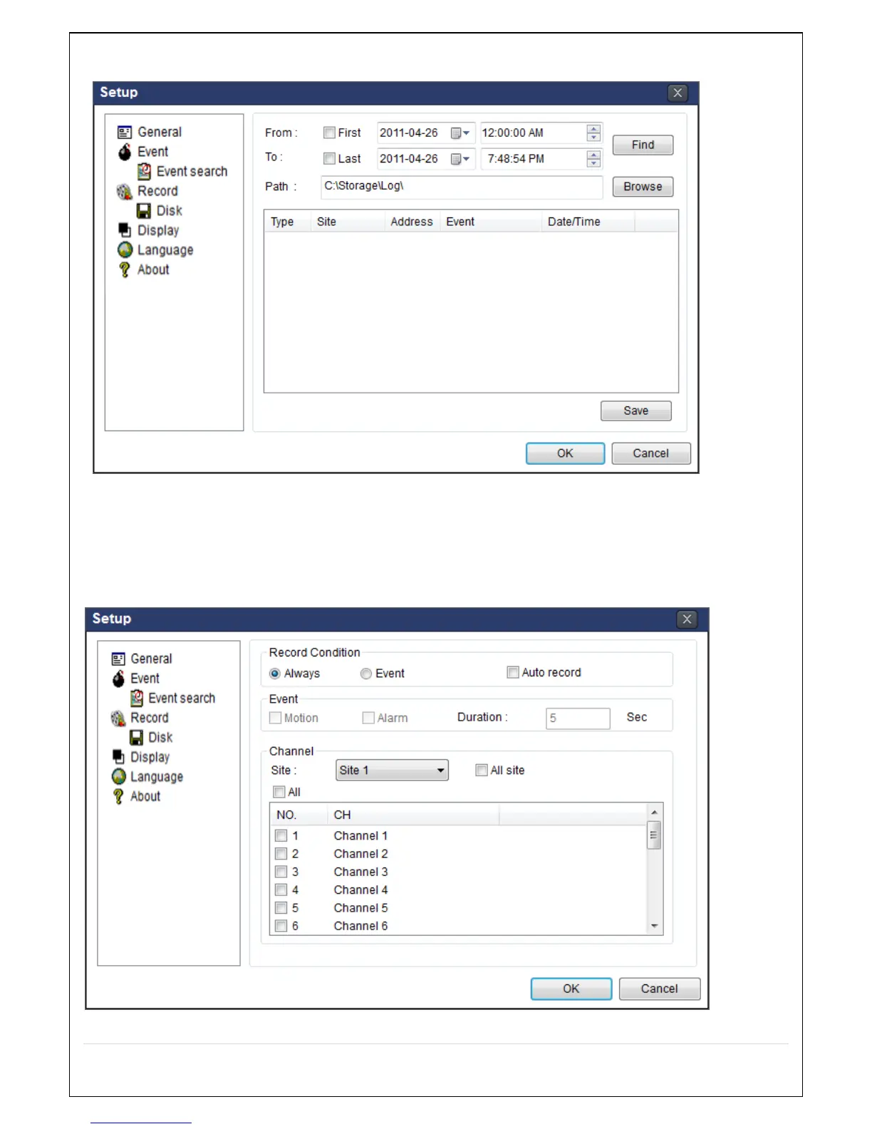 Record Setup: You can set the recording conditions as the following; Always, Event, or Auto record. And