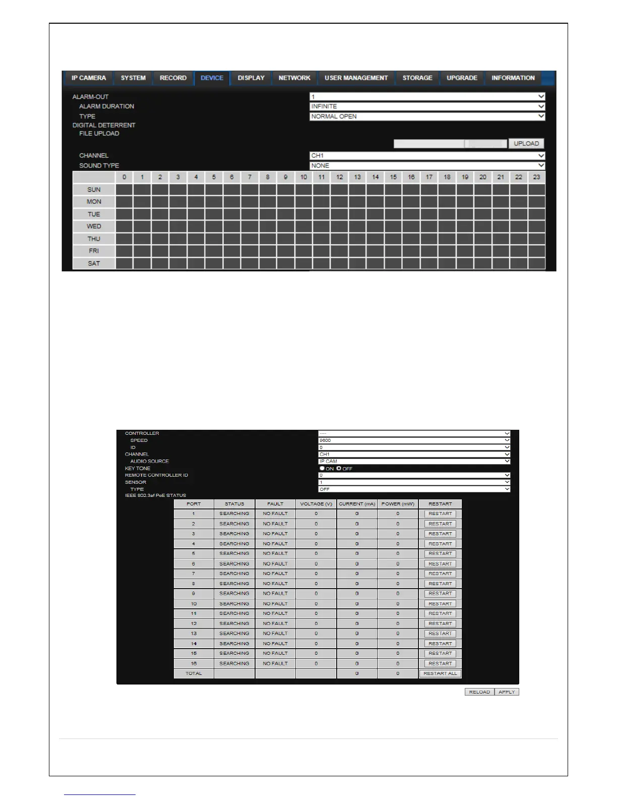 ALARM OUT: Set the sensor, motion, and video loss for triggering alarm relay.