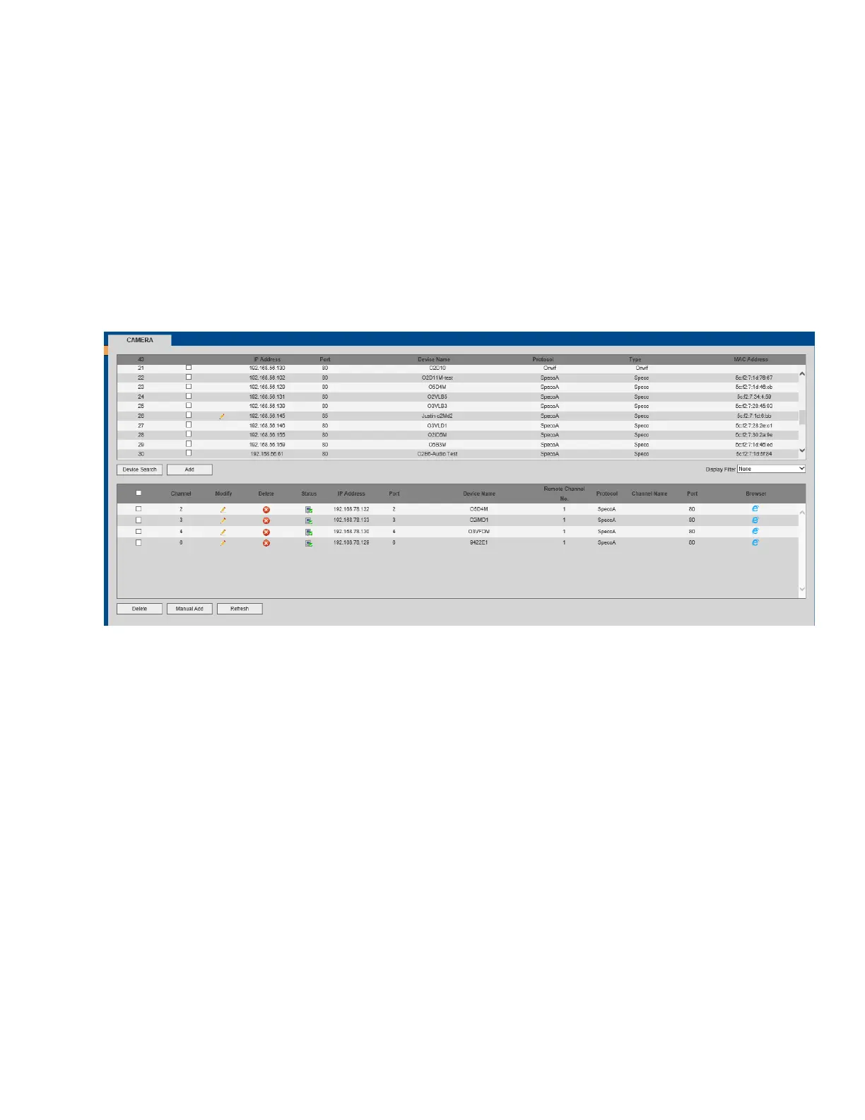 Go to Setup->Camera->Camera to set up cameras on the device. See Figure 5-16. Click on Manual Add to